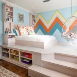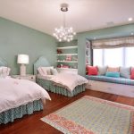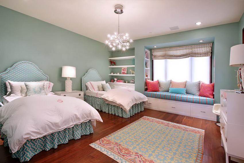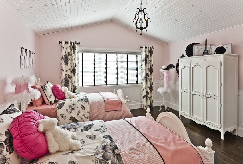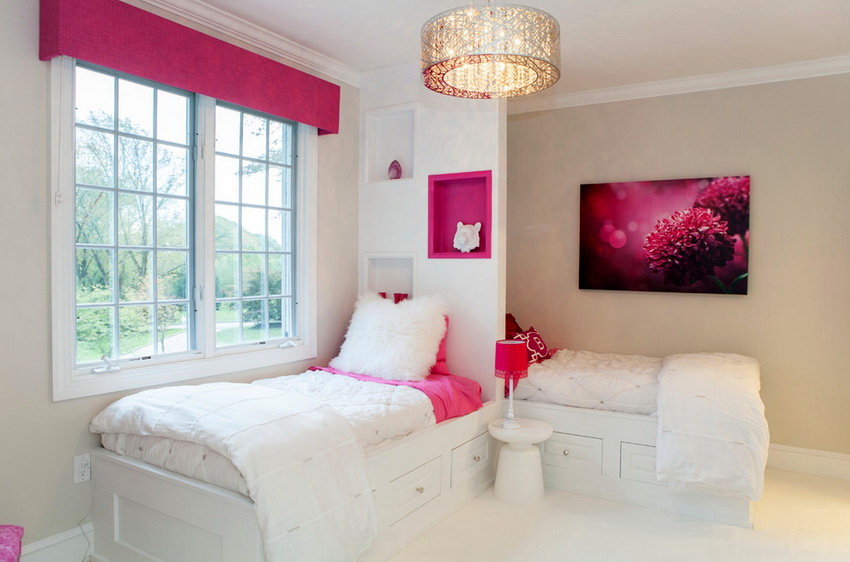 For two sisters, you can install a double sofa bed or a bunk bed for girls. Photos show numerous types of models. Also popular are pull-out models equipped with a convenient and compact storage system for linen and other things. For a spacious room, a multifunctional design in the form of a loft bed for two sleeping places is a good solution. Downstairs there is a spacious wardrobe, a chest of drawers, open shelves and a desk.