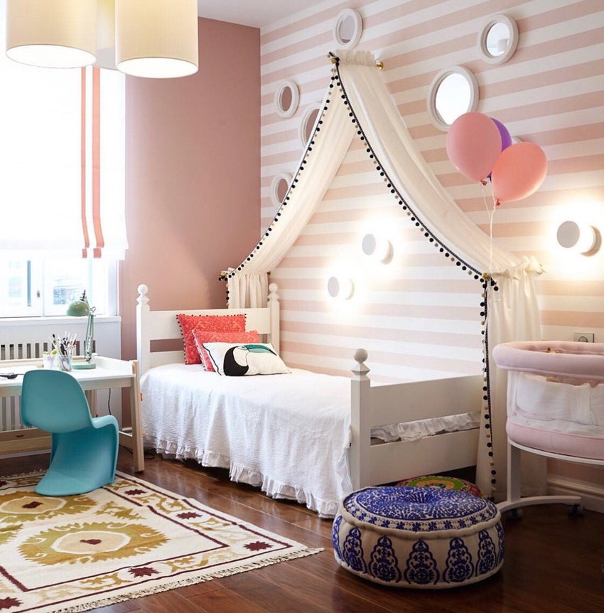 If the children's bedroom is small and it is not possible to install a bed of an unusual shape, you can purchase a classic model with a canopy. This element is stretched at the top of the bed and descends in a flowing wave, as shown in the pictures of children's beds. It can be hipped or rectangular. The canopy not only plays the role of a decorative element, but also performs a psychological and practical function. He is able to protect the young lady from drafts, bright rays of the sun and annoying insects. Moreover, such an aerial fence gives the little girl a sense of security.