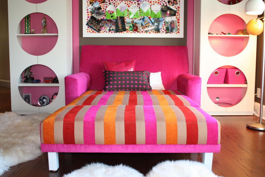 For small apartments, a couch bed has recently been very popular, which serves as a sofa during the day and turns into a double bed for two girls at night. The design is necessarily equipped with a deep niche for storing linen. This bed does not have sides, therefore it is recommended for girls of older school age.