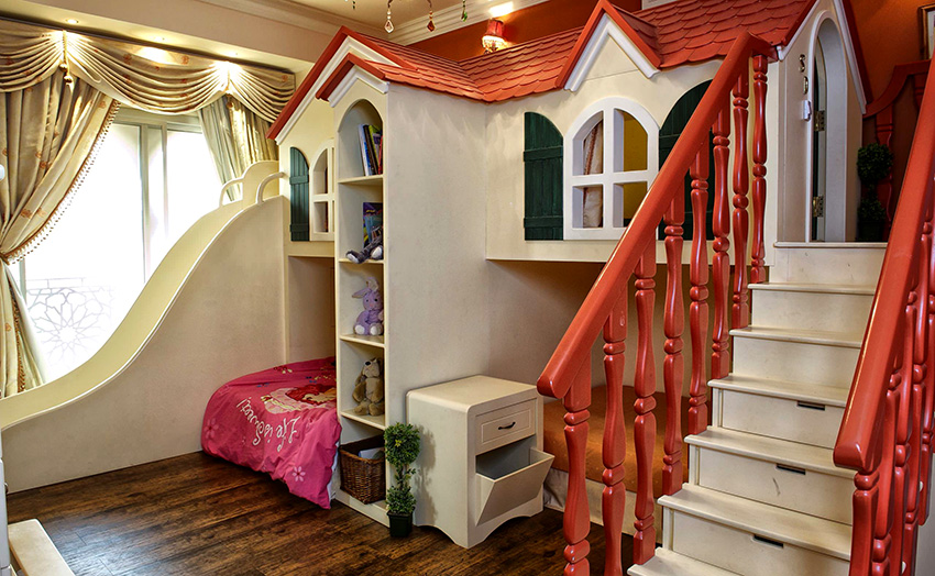 The castle bed is a fabulous building that looks like a medieval building, a forest house or a beautiful princess's palace. The sleeping place is usually located below. The upper part is reserved for games. Modern models of these beds are based on favorite cartoons and games for girls. Beds with images of Disney characters and Winx fairies are very popular.