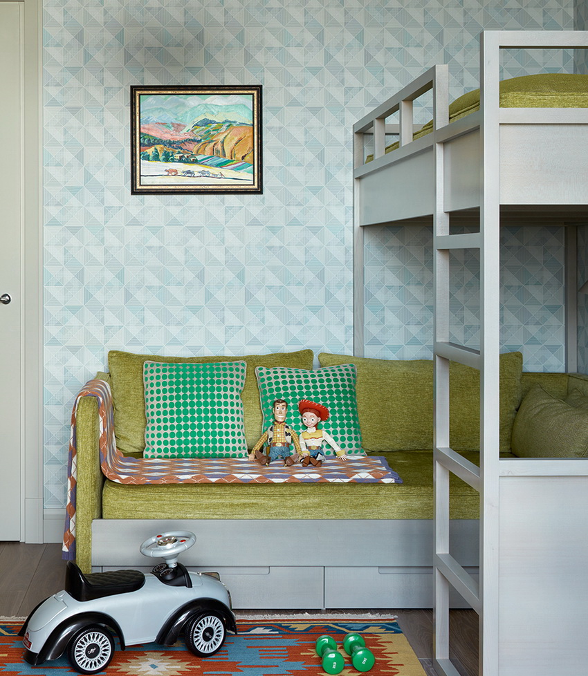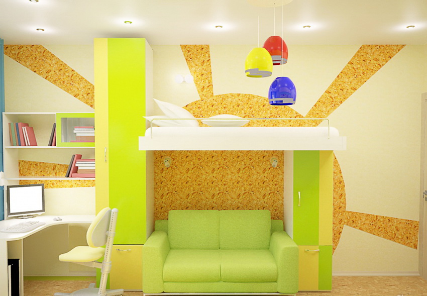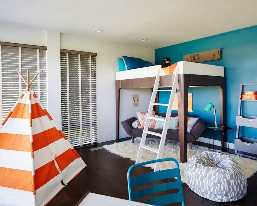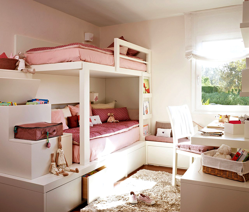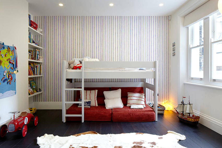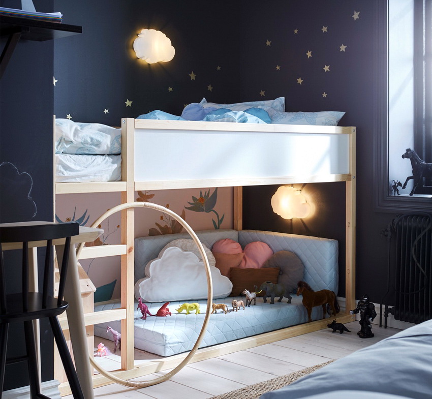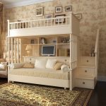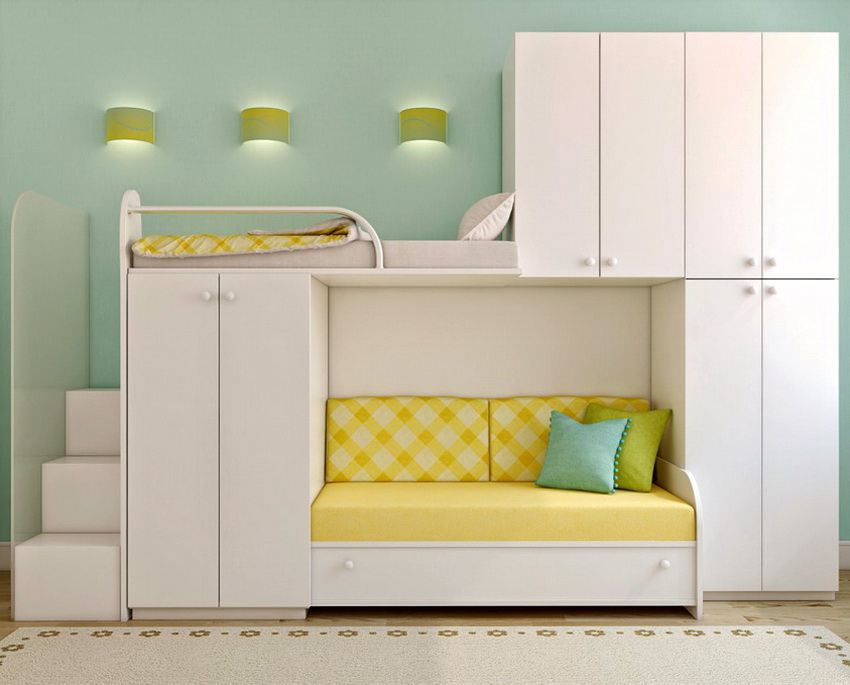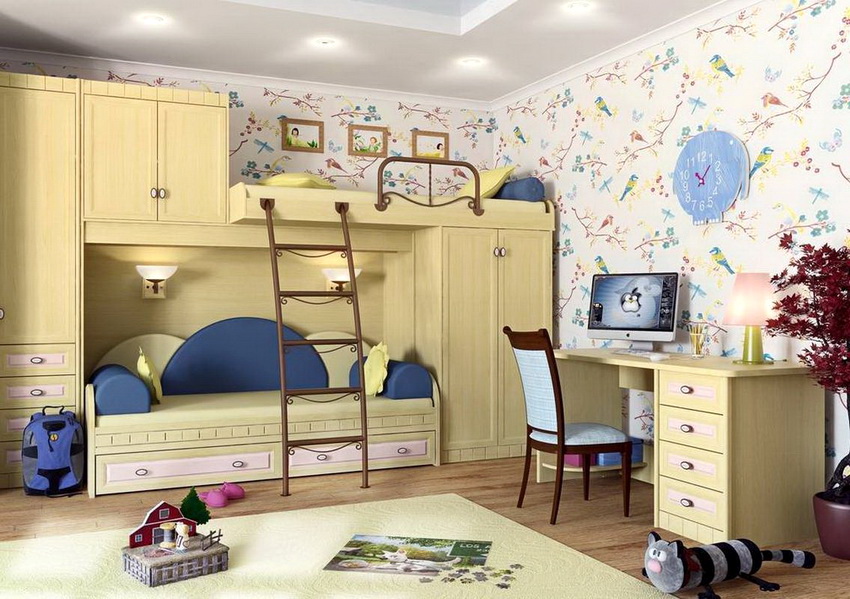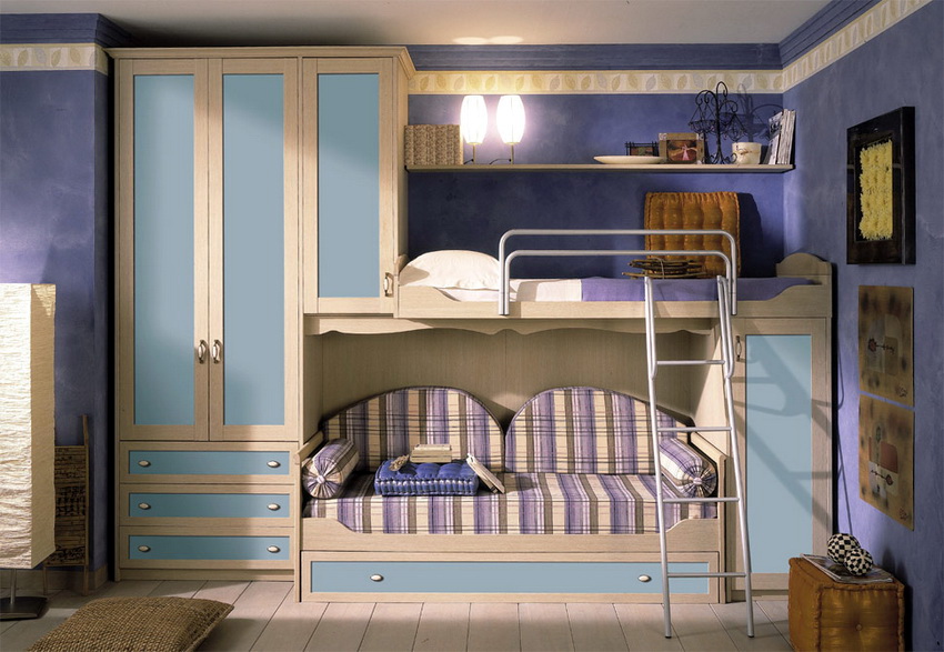 There are many models for arranging a children's room. A popular option is a bunk bed for children with a sofa at the bottom, where the sleeping place is at the top and equipped with handrails.The sofa can be stationary or folding, turning from a relaxation area into an additional place to sleep.