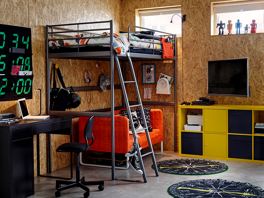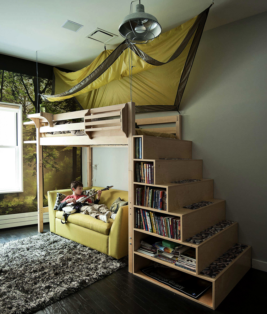 A loft bed is the best option for a teenage room. Often the second floor of this design serves as a place for the child's privacy, which is important in the transitional age. At the same time, the lower sofa is a place to socialize with friends and parents.