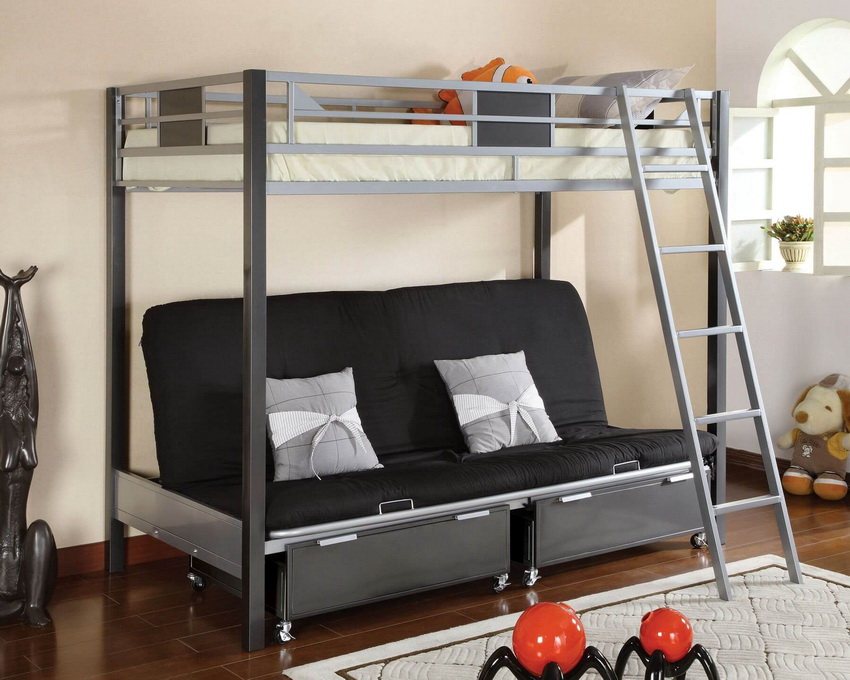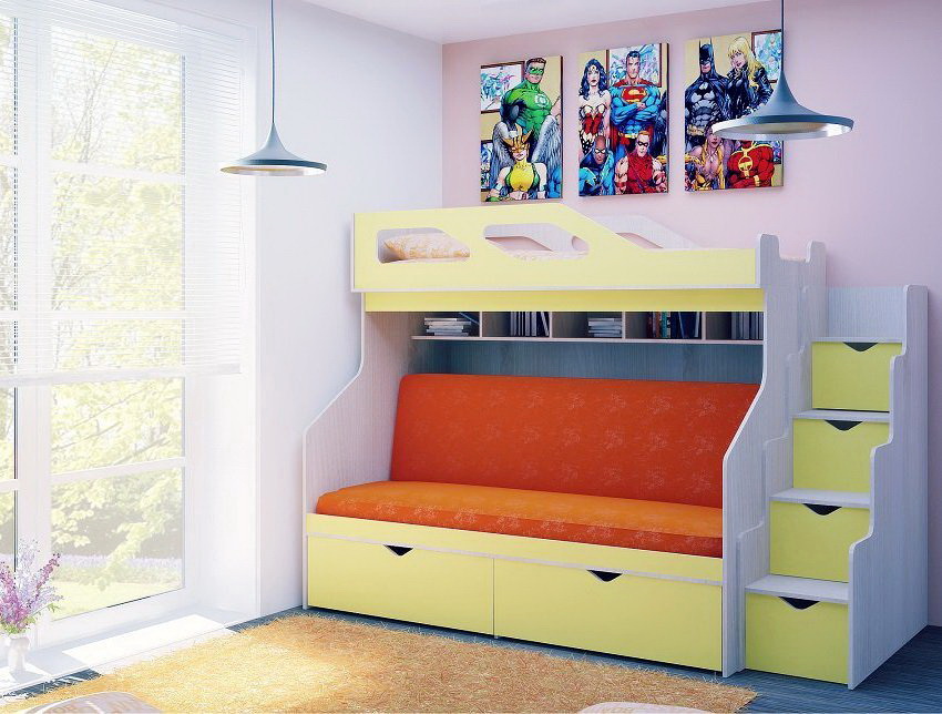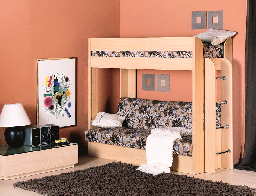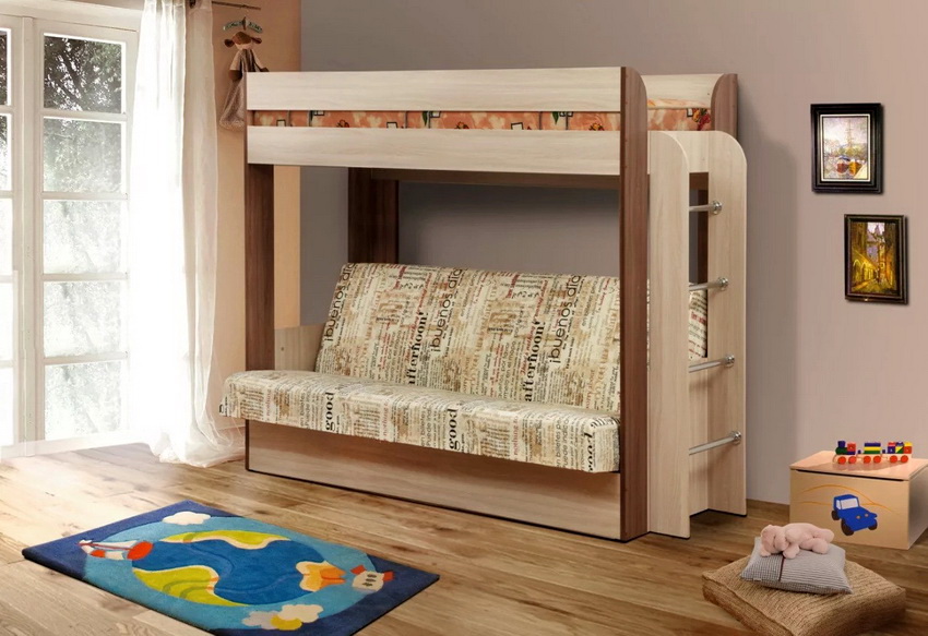 More recently, manufacturers have presented an evolutionary model, a new modified version of the product - a bunk bed with a sofa below. The invention significantly expanded the range of advantages of two-level beds and went beyond the bedrooms. In particular, transformer models have appeared, in which, through simple movements, an ordinary sofa turns into a bunk bed.