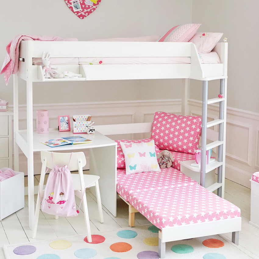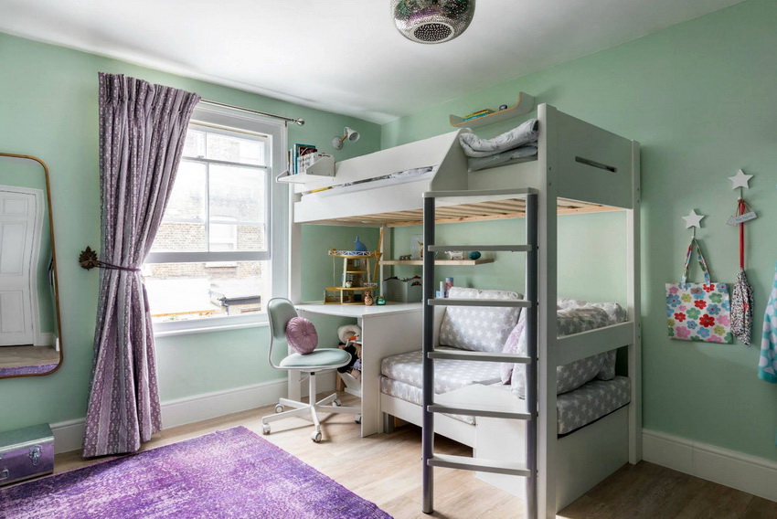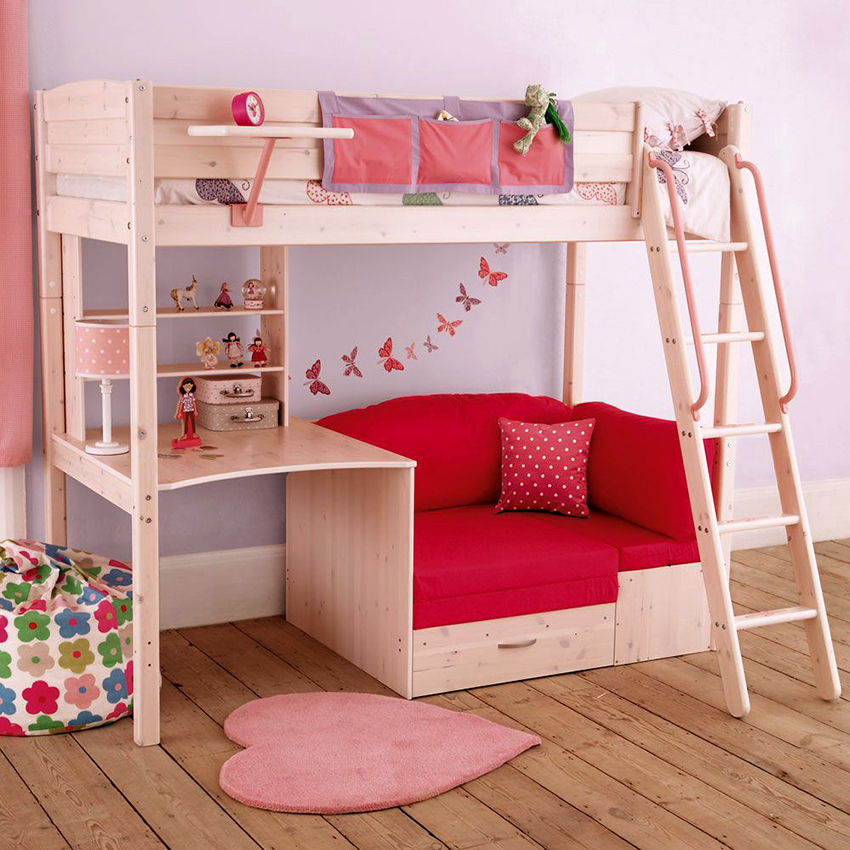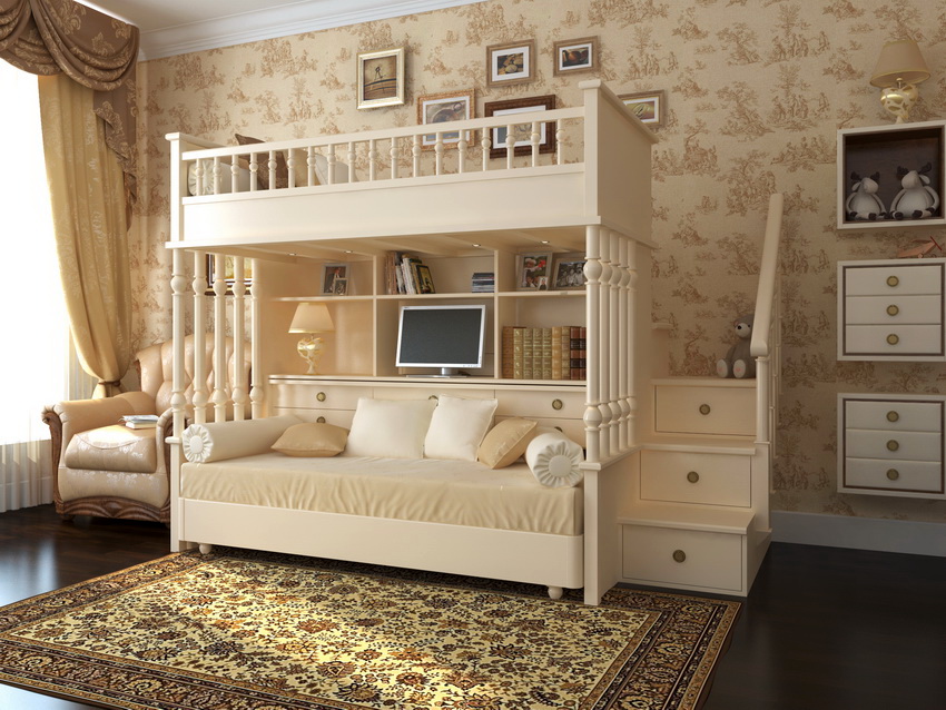 The loft bed is perhaps the most common version of bunk beds for children's rooms now. There are two versions. The classic model is equipped with a sleeping place at the top, a wardrobe and a desk at the bottom. Such a complex is ideal for a room where one child lives. Another version is a loft bed with a sofa. The main difference is two berths: instead of a table, a sofa is installed below, which turns the structure into a full-fledged bunk bed.