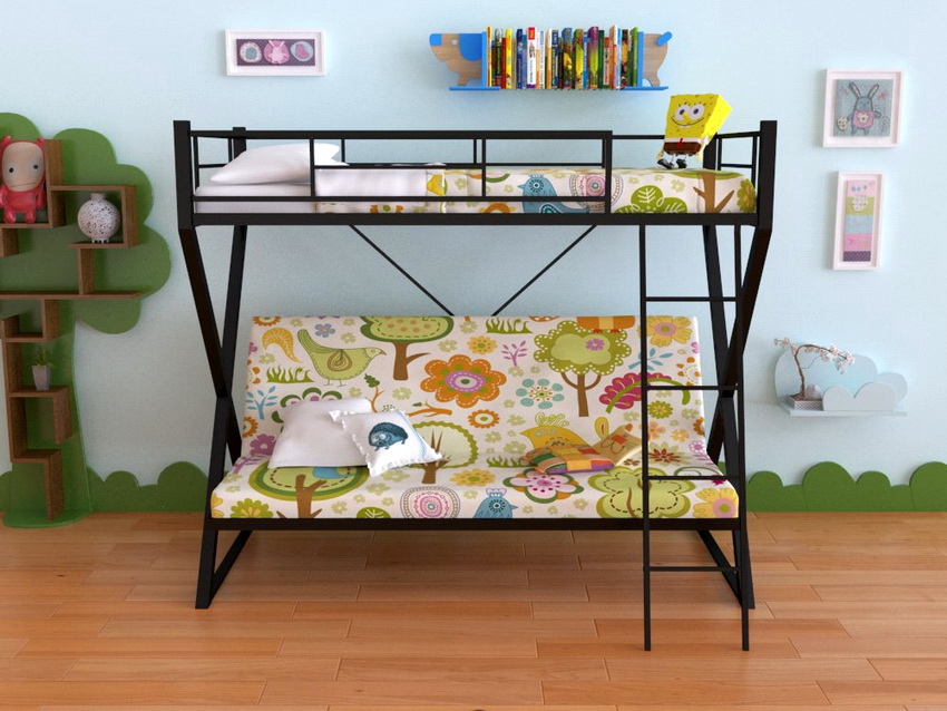In the event that the room is used not only as a bedroom, but also as a living room, the best option is a double bunk bed with a sofa bed below. Folding mechanisms can be selected universal - this is the so-called "book" or "eurobook". They differ from each other in the way of reclining the back.
