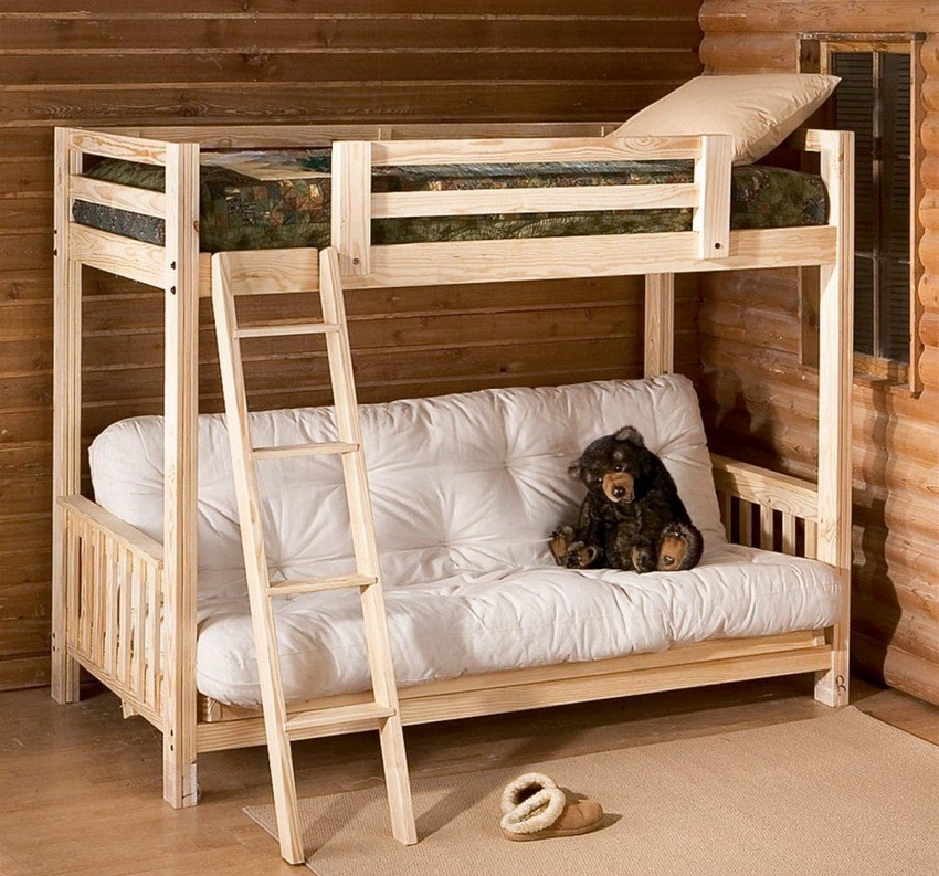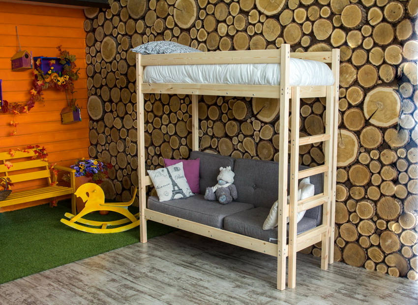 Bunk beds with a sofa below: structure and materials