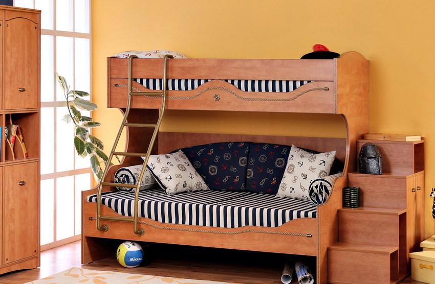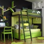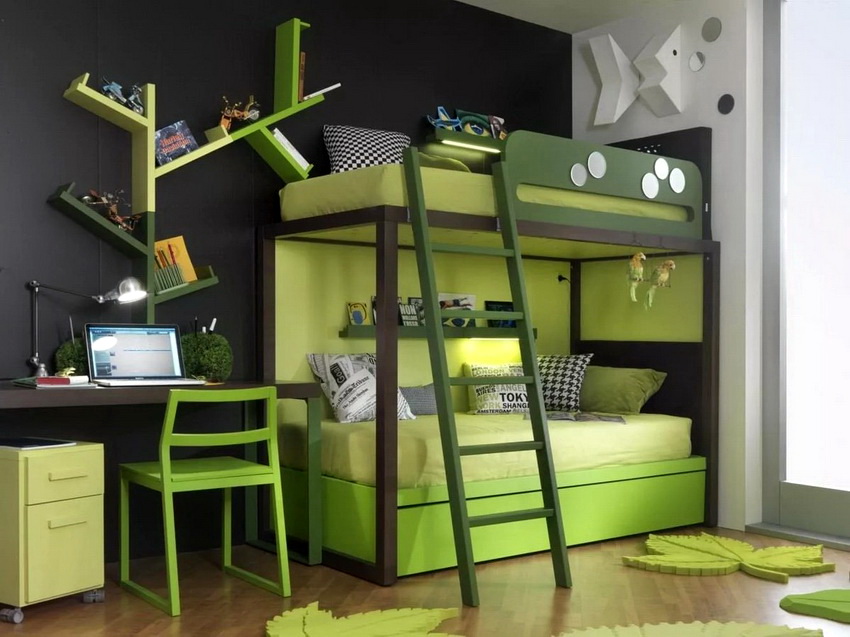 The advantage of chipboard furniture is a wide range of colors of laminated boards. For a children's room with a bunk bed, this feature allows you to choose models with bright decorative elements, drawings or even photographs.