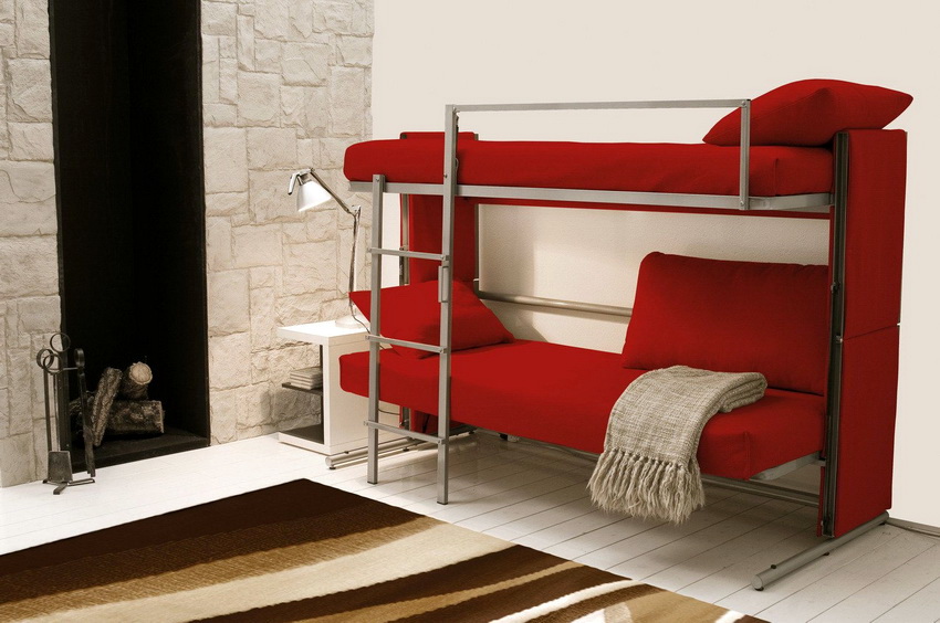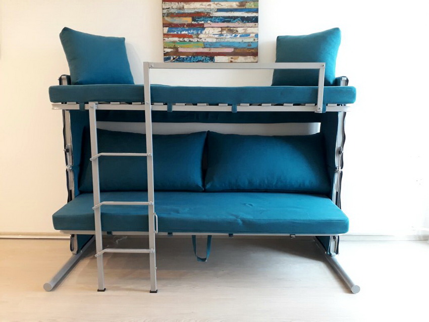 Considering the topic of bunk beds, one cannot fail to mention such a rather new, original and comfortable look, like a convertible sofa into a bunk bed. The price of structures is far from democratic, its formation is significantly influenced by the complexity of the transformation mechanism, which allows a simple, at first glance, sofa to be turned into a bunk bed. This can be done almost effortlessly - with a slight movement of the hand.