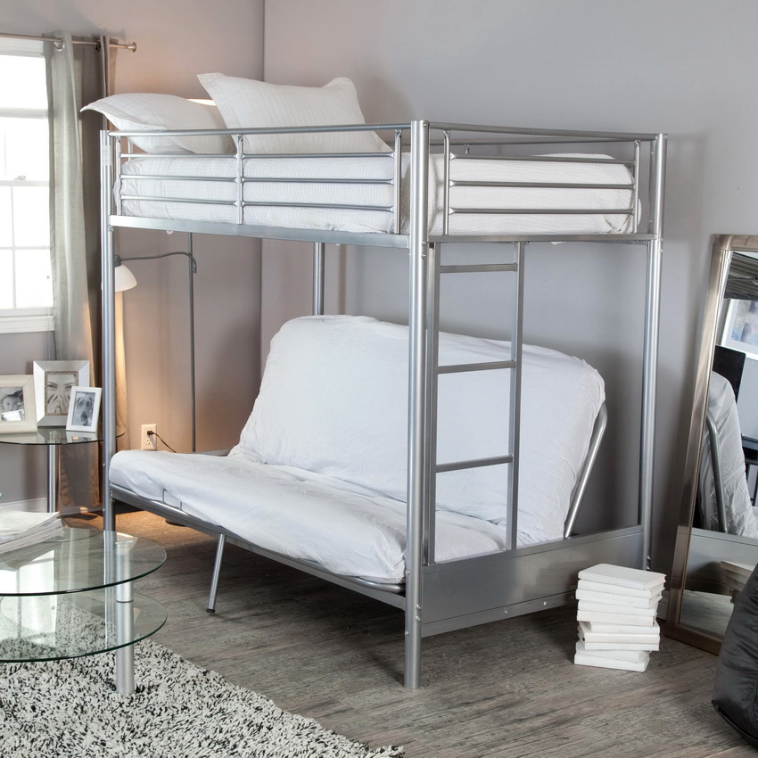 It is recommended to choose a bed that serves for parents and a child with a large berth at the bottom and a middle one at the top, given that the child is growing. The small bed will have to be changed soon. The size of a bunk bed for adults with a sofa below can be either one and a half or double.