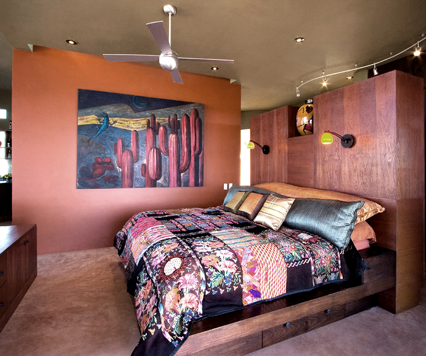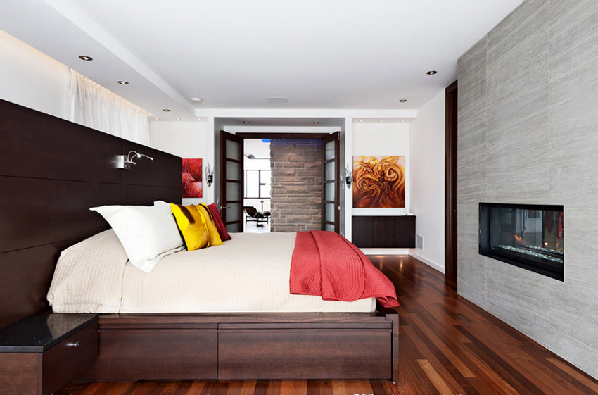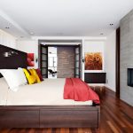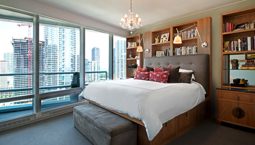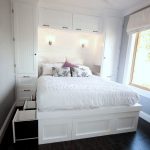 For a medium or large bedroom, a double bed with shelves at the headboard is suitable, on which you can place bedside lamps, as well as store your favorite books, photographs or any other items. The number of boxes in a large bed often varies from 4 to 8, although options are possible: you can make two large roomy compartments, or break them into many small boxes. Below is a selection of photos of double beds with different drawer layouts.