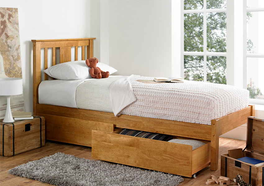 In single beds, drawers are placed on one side