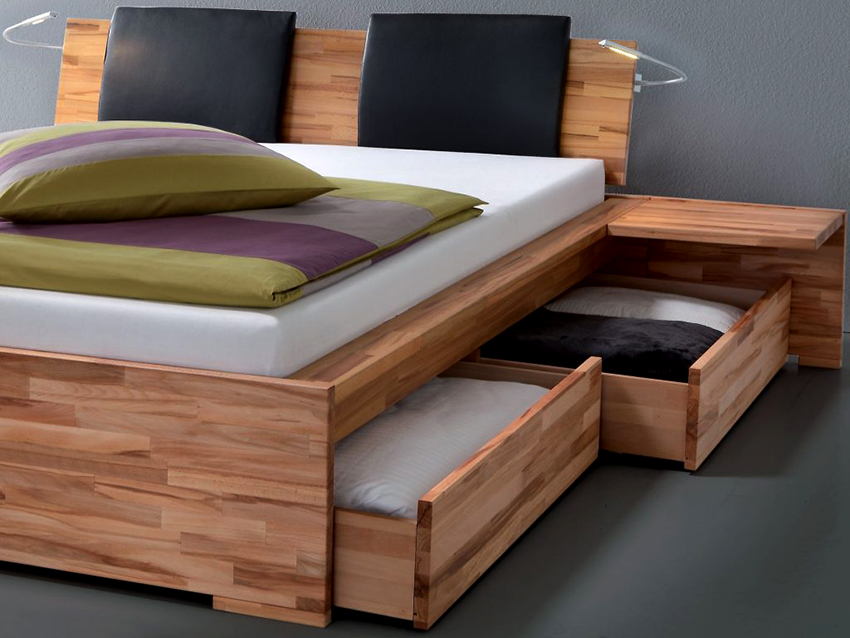 Beds with additional storage for things differ not only in the number and way of placing the boxes, but also in the type of mechanism that provides access to the niches. Based on this criterion, products with retractable and lifting mechanisms are distinguished. Drawers are used to organize multiple drawers. At least the bed accommodates two large drawers, although in some cases you can see up to ten small compartments that make it possible to neatly fold things. The work of such boxes is easy to organize: some guides are located inside the bed, while others are on the side edges of the compartments.