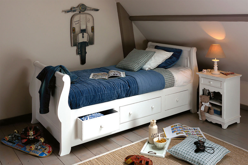 A single bed with drawers is most often used to create the interior of a nursery or teenage room. This version of the product is a comfortable and spacious sleeping place, complemented by a full storage for clothes, toys or other children's items. Installing a multifunctional bed, even in a small nursery, will help free up enough space for play.
