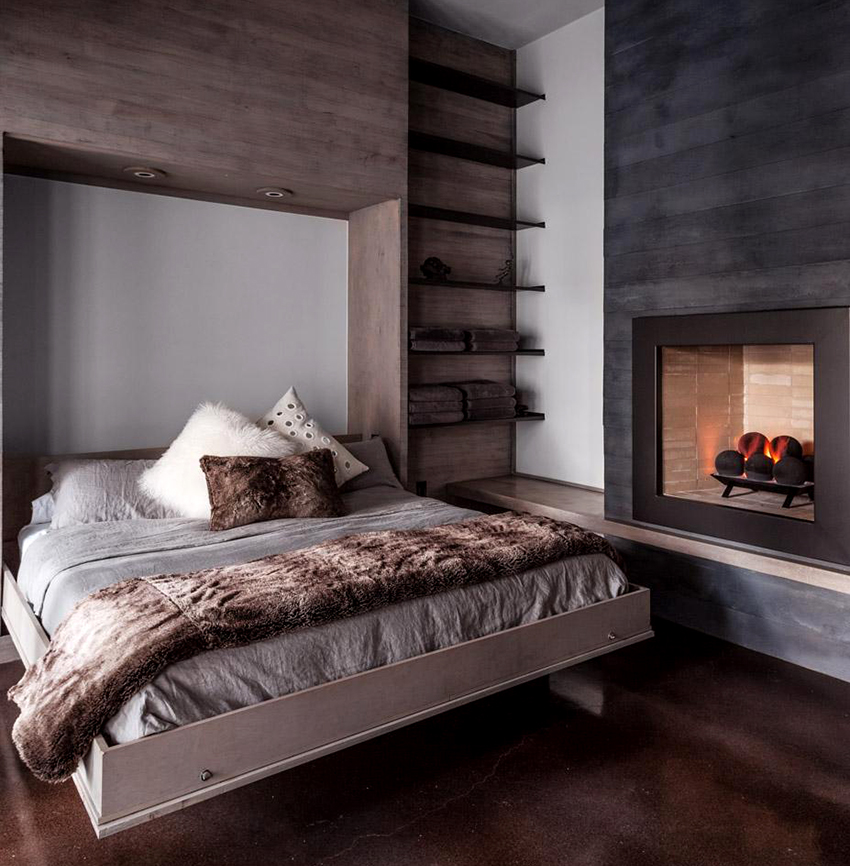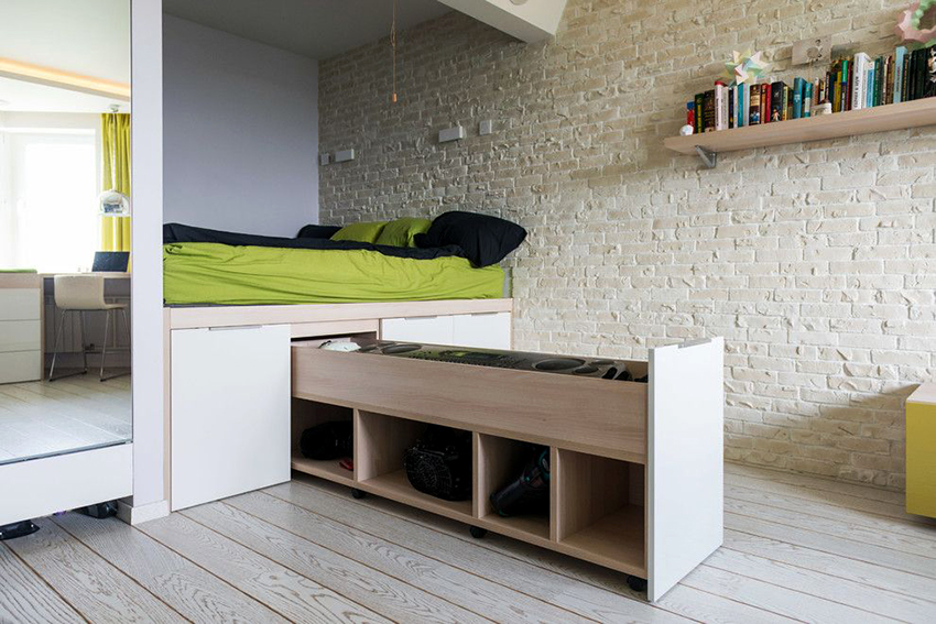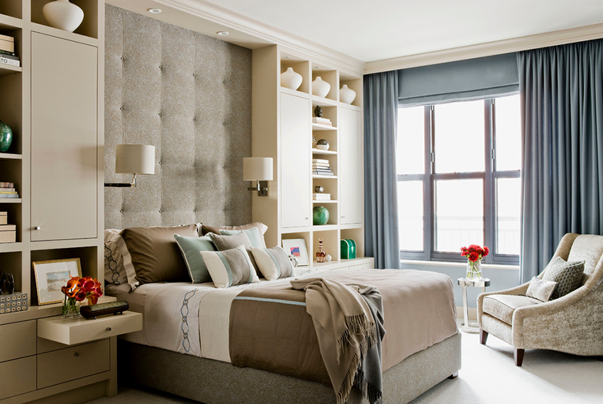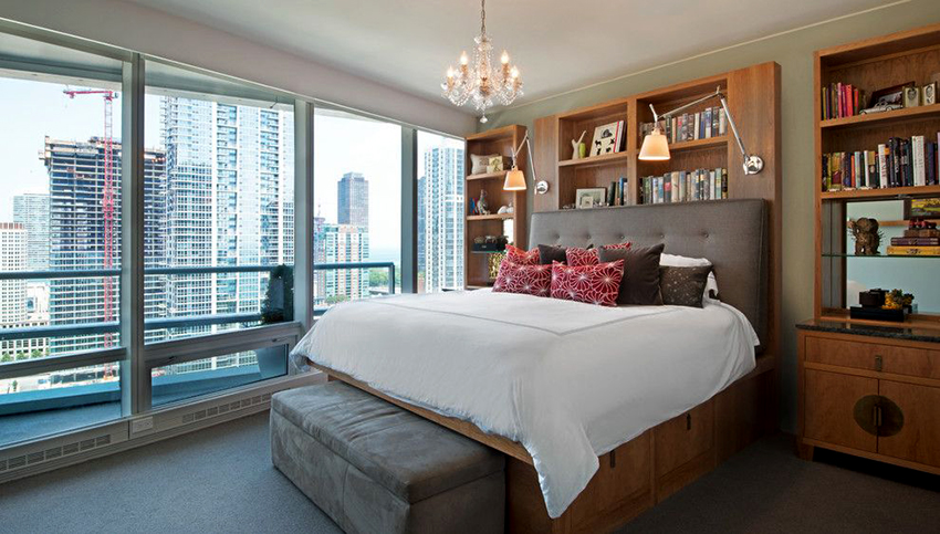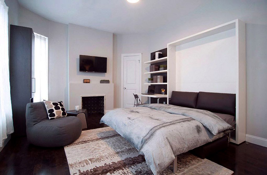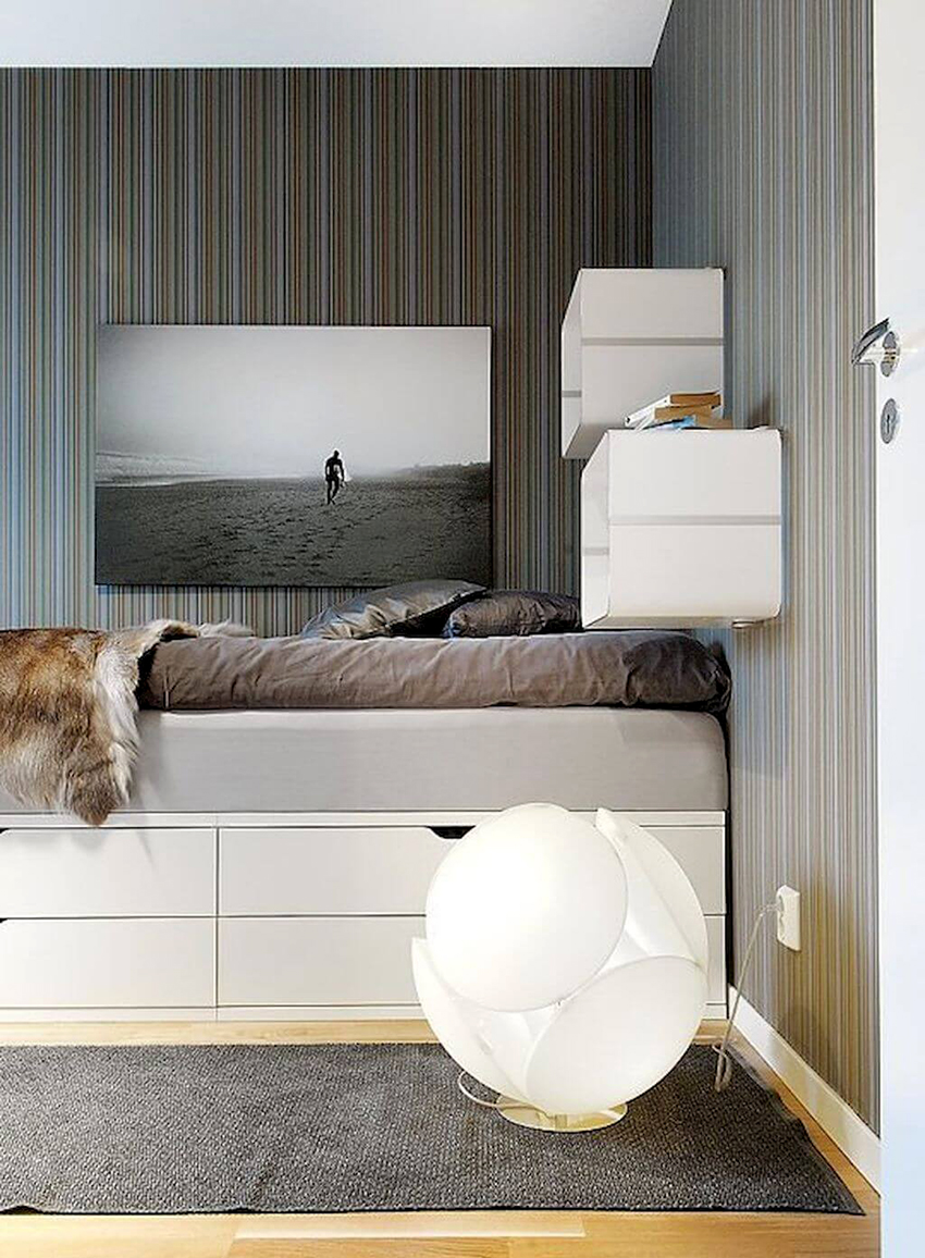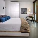 The latter design option is often installed in small rooms, where it is important to rationally use every centimeter of space. Here you can equip a spacious storage system in the bed area.