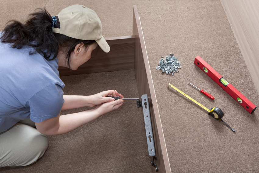 Next, the lifting mechanism and gas springs are attached to the sides of the cabinet. The first element connects to the bed frame. To fix the elements, it is very important to use strong bolts that allow you to carefully screw the parts together, since this place will take maximum loads.