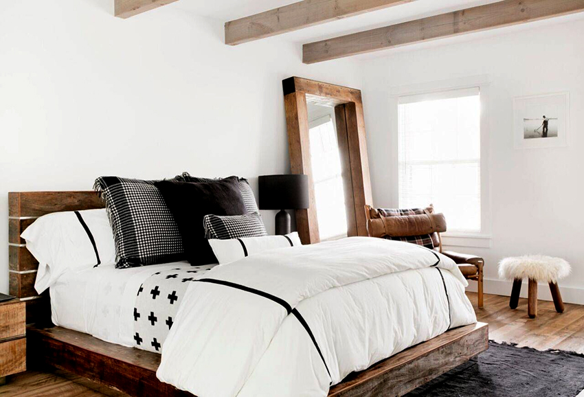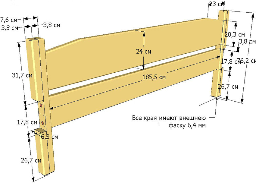 Next, the headboard and foot of the bed are made. For this, furniture board, chipboard, MDF are used. Products can be of various configurations and heights. The final stage is the installation of the bed legs. They are usually made from logs or blocks. Products can be a continuation of the vertical racks of the headboard and foot of the bed. Their optimal height is 25 cm. They are attached with metal corners and self-tapping screws.
