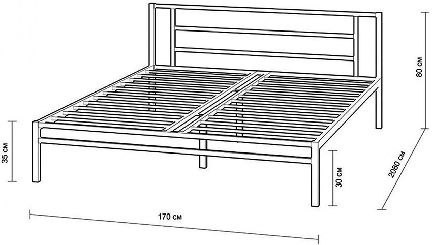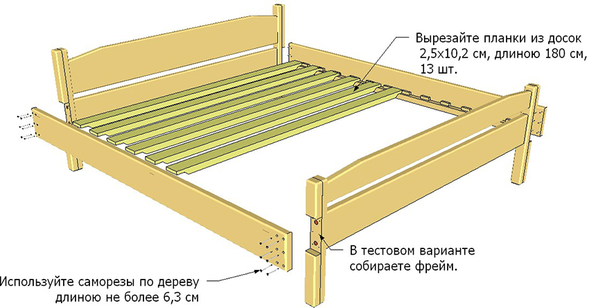 Along the long frame elements on the inner side, beams are attached under the rack base. Their upper edge (this is clearly seen in the drawing of a double bed) is located in the same plane with the upper border of the lintel. Slats 170 cm long are made from 20x100 mm boards. They must be laid and fixed across the lintels and longitudinal support beams with a step of 3 cm. The first and last elements must be tightly adjacent to the front and rear walls of the bed frame.