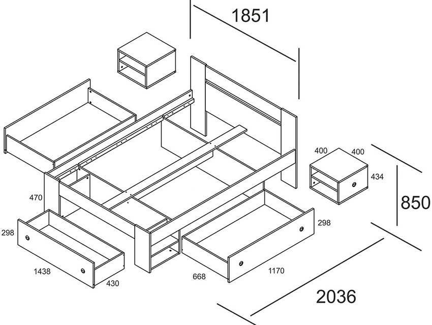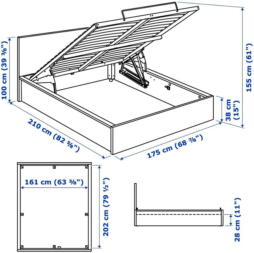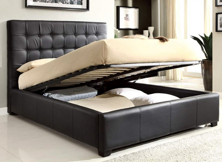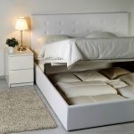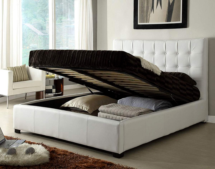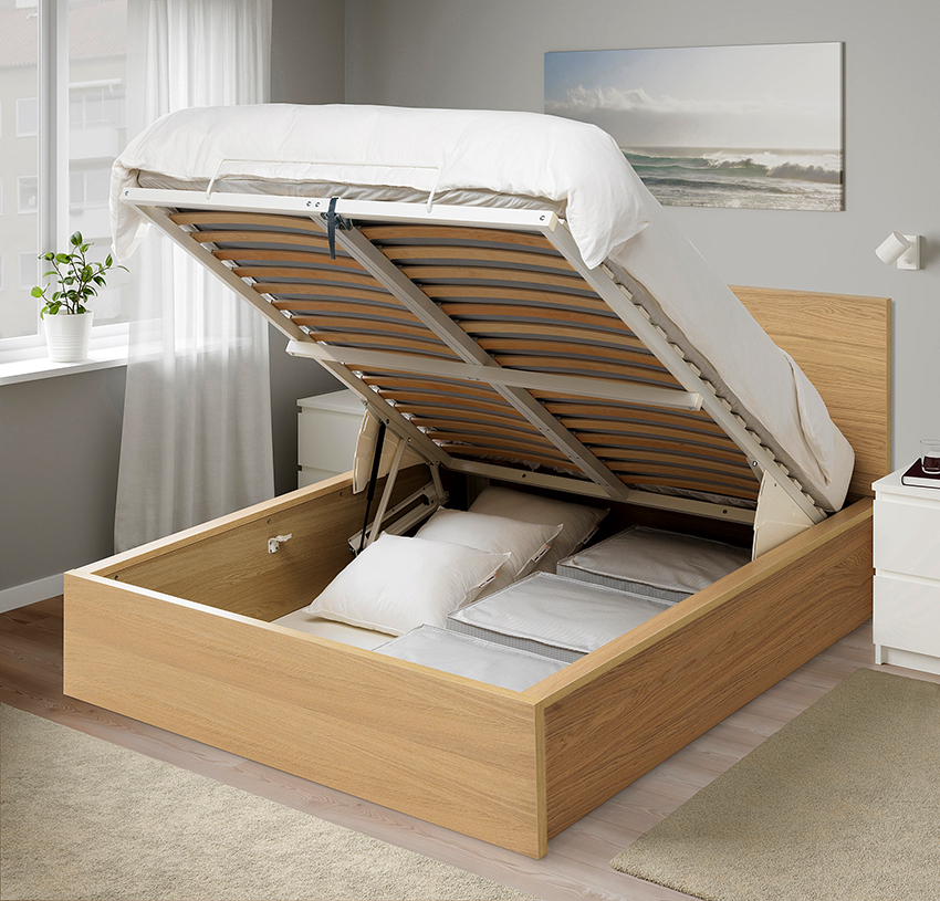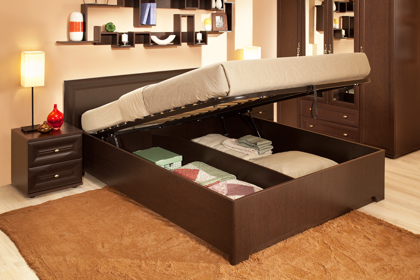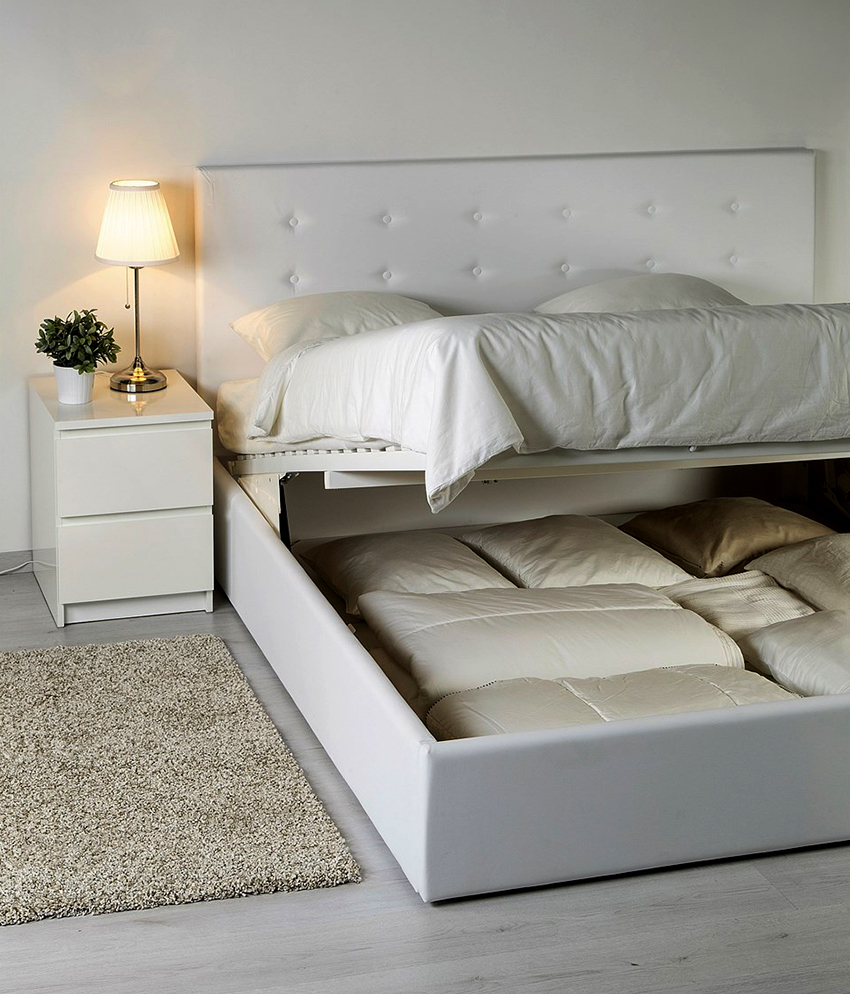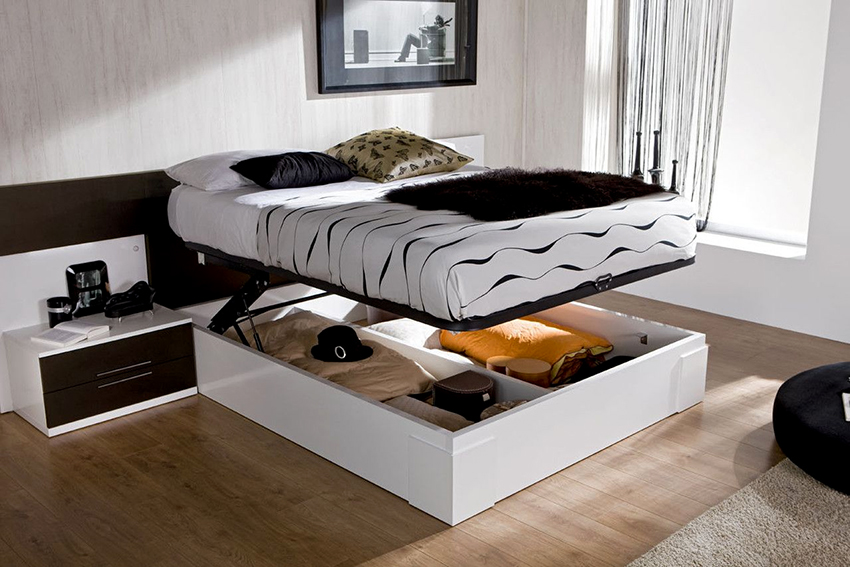 If the product rests on the sidewalls, there are usually storage boxes under the mattress. They can slide out to the side of the structure, or the storage space opens when the mattress is lifted from the foot side. This mechanism is called gas lift.