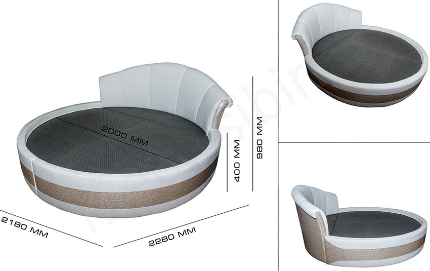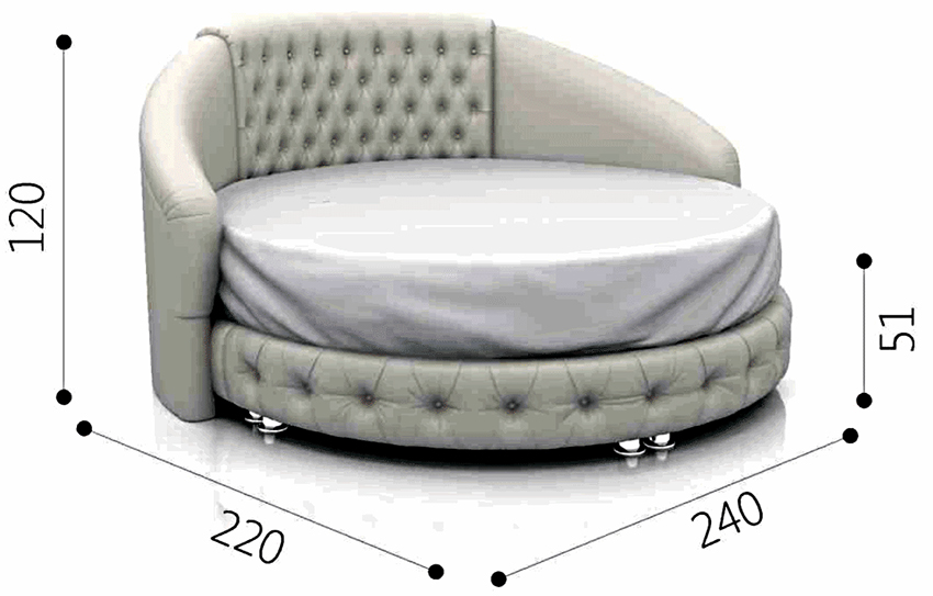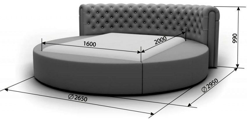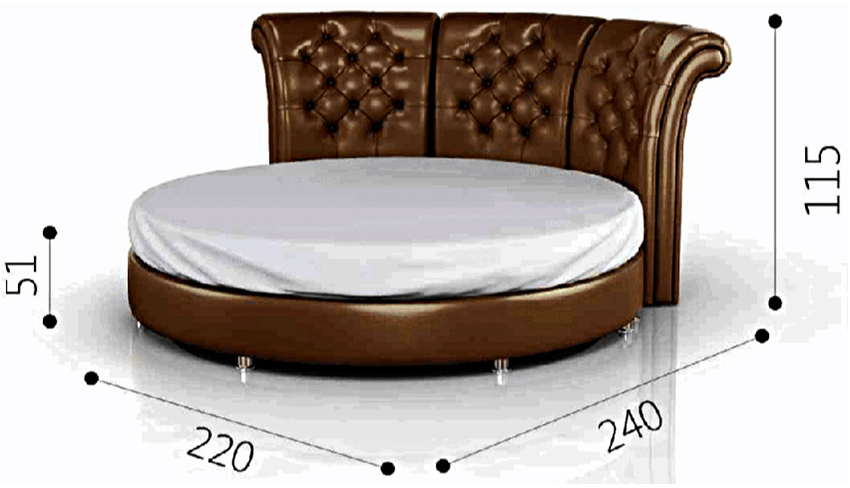 The bed can be not only rectangular, but also round. The standard size of such a product is 220 cm in diameter.
