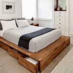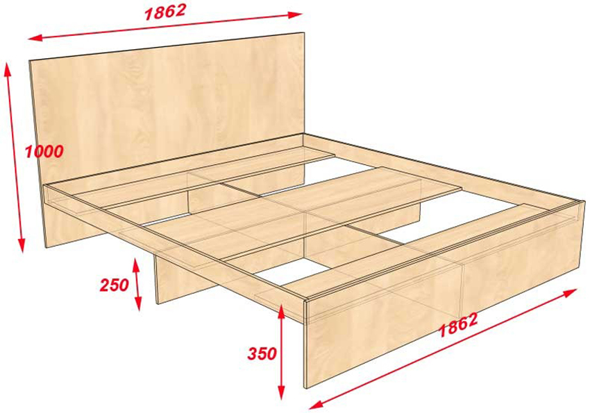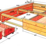 Using a drawing of a bed made of wood with your own hands, drawers, sidewalls, a headboard and the bottom of the boxes are made from chipboard or MDF. The base frame is made of wooden blocks. The bottom for the boxes is attached to it. Drawers and side elements are installed on the frame, on top of which the slatted flooring is placed under the mattress. A headboard made of chipboard is fixed on the base.