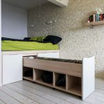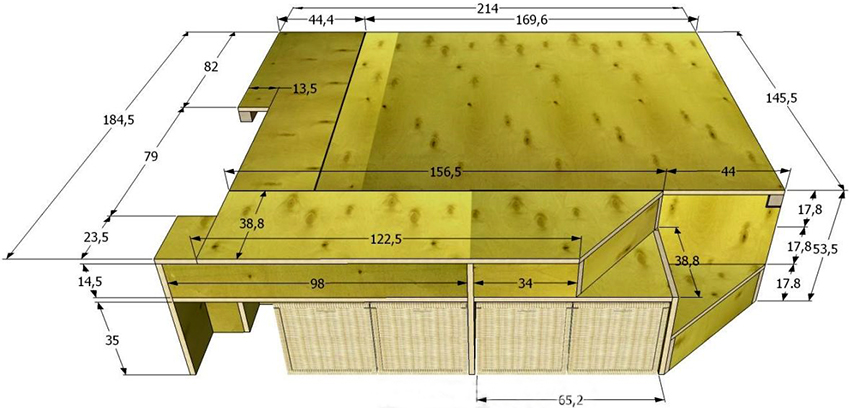 The next step in making a podium bed with your own hands is making markings for drawers. The planks that form their frames must be attached to the bottom of the racks. Partitions are attached to them. A base for the mattress is created, which is a lattice surface.