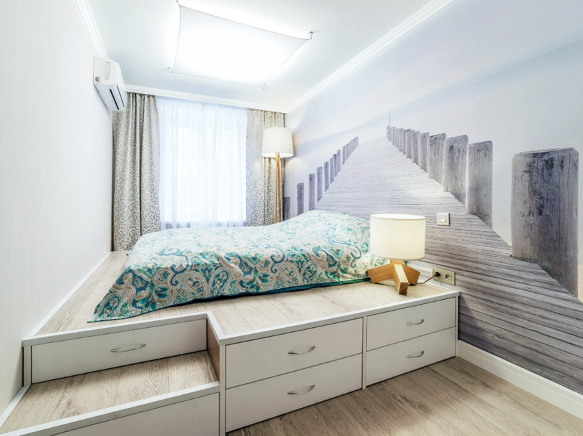 Before you make a bed with a podium yourself, you need to decide on the location of the product. The space should allow pulling out drawers or a sleeping place. A drawing of the finished structure is created, after which the corresponding markings are made on the walls and floor of the room.