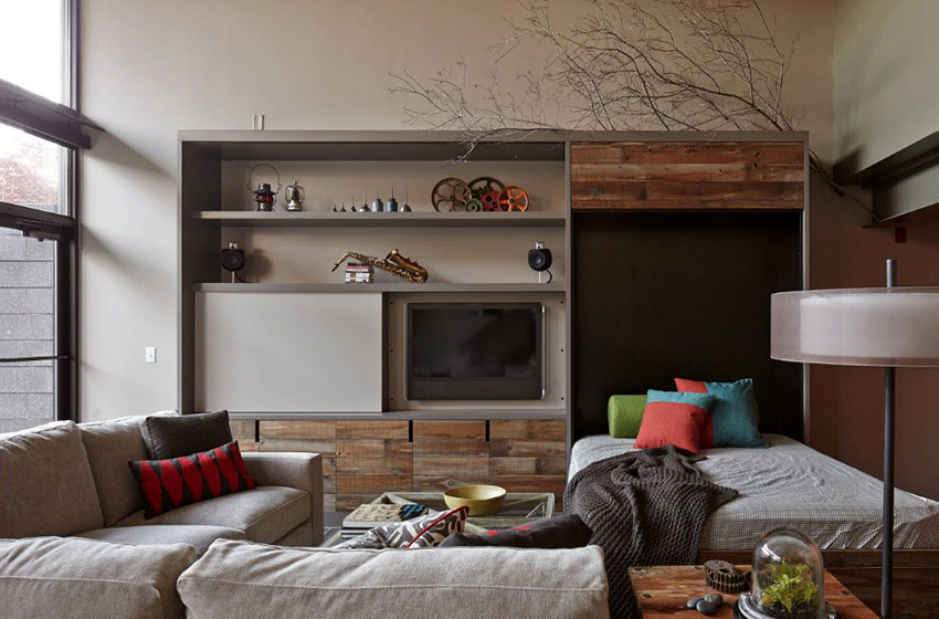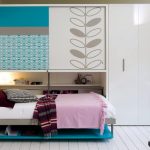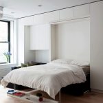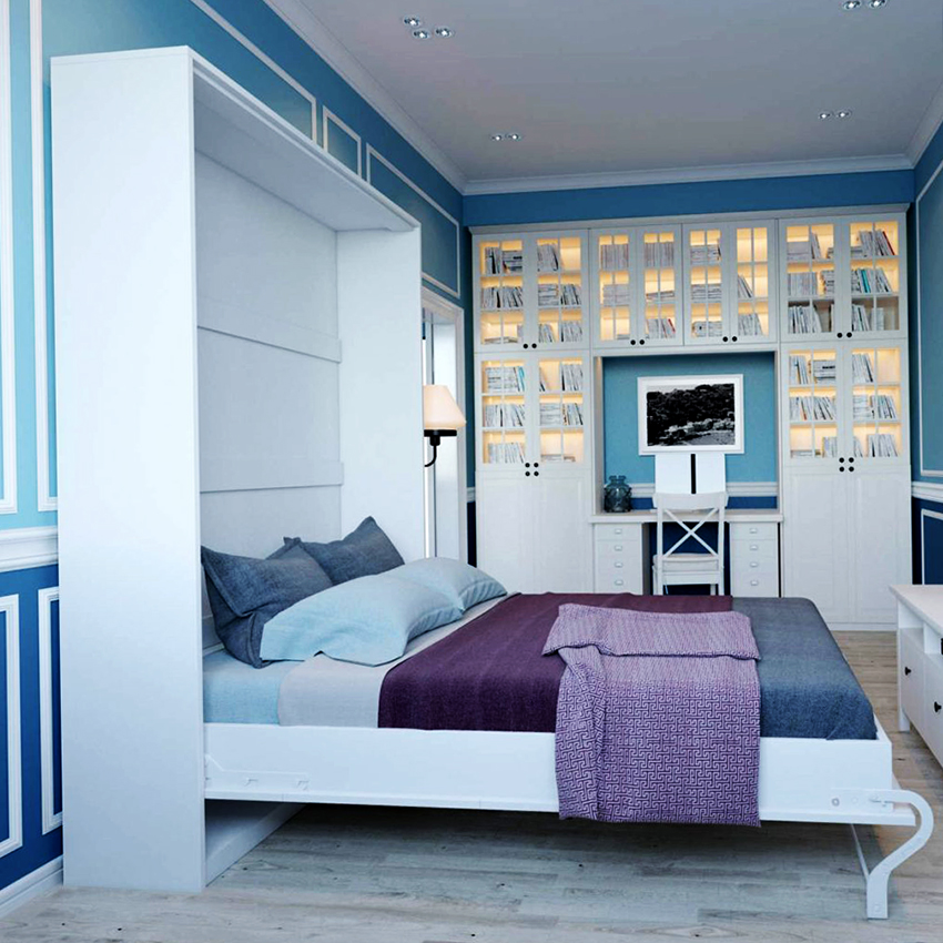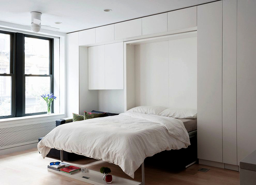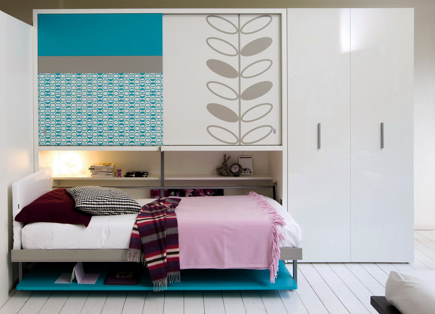 Do-it-yourself wardrobe bed at home has an unusual look. The bed is removed in a special storage, which is not visible from the side. This model fully allows you to save free space, since the assembled structure is part of the cabinet and does not take up space.