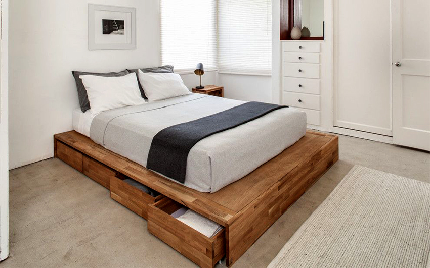 How to make a podium bed? To create a frame, you will need a bar with a section of 50x50 mm. For rough finishing, chipboard or plywood with a thickness of at least 12 mm is used. For the finishing cladding of the structure, chipboard is used. Drawers are made of plywood.