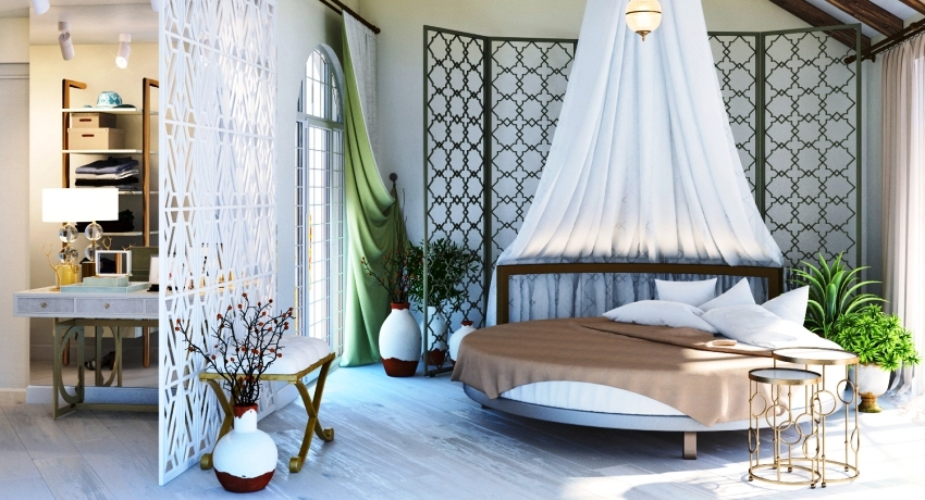 Room interior design with round double bed
