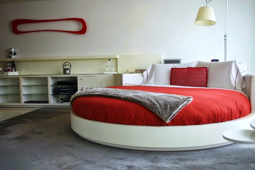 It is interesting! Round beds are often chosen for a bedroom with an elongated balcony.In this case, the sleeping bed has to be installed in the corner, but this is the best option, since a rectangular bed in a narrow room would leave bruises on the legs of its owners.