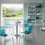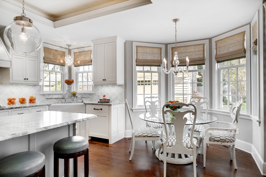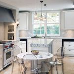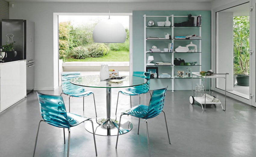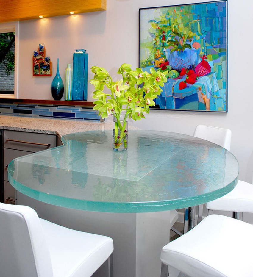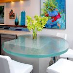 Recently, round glass tables in the kitchen have gained particular popularity. For the manufacture of countertops, tempered glass is used, which is a durable material that is resistant to mechanical stress, and even if it cracks, it shatters into mild fragments, eliminating the possibility of injury.