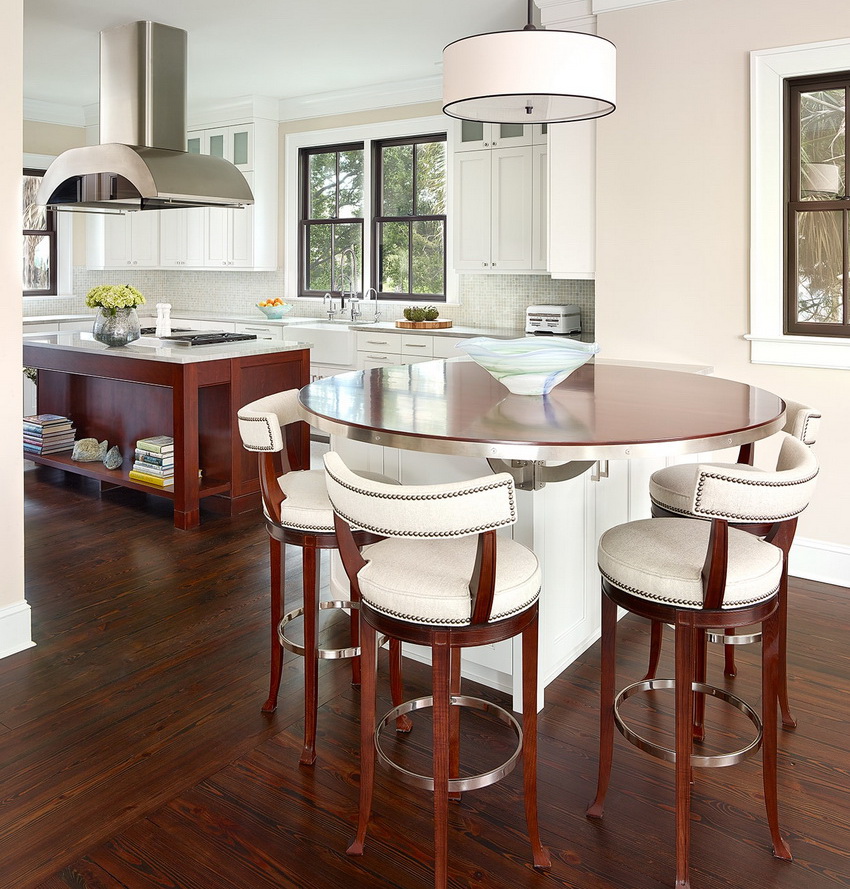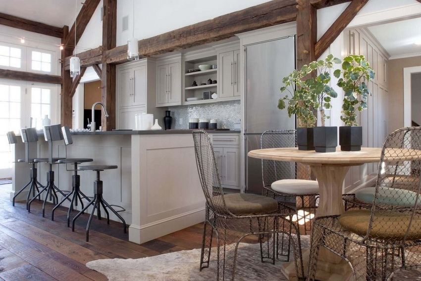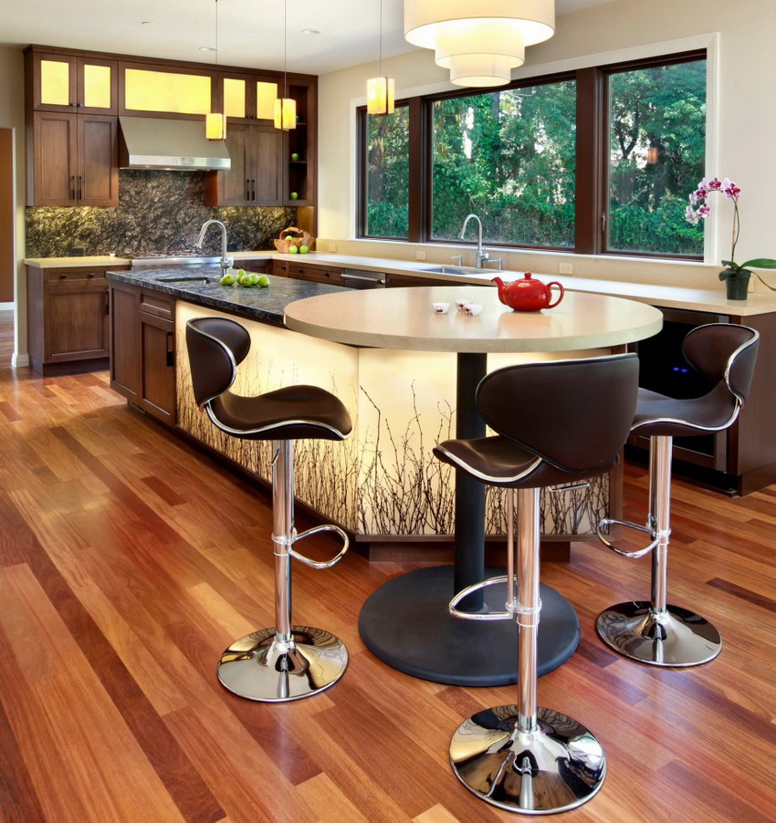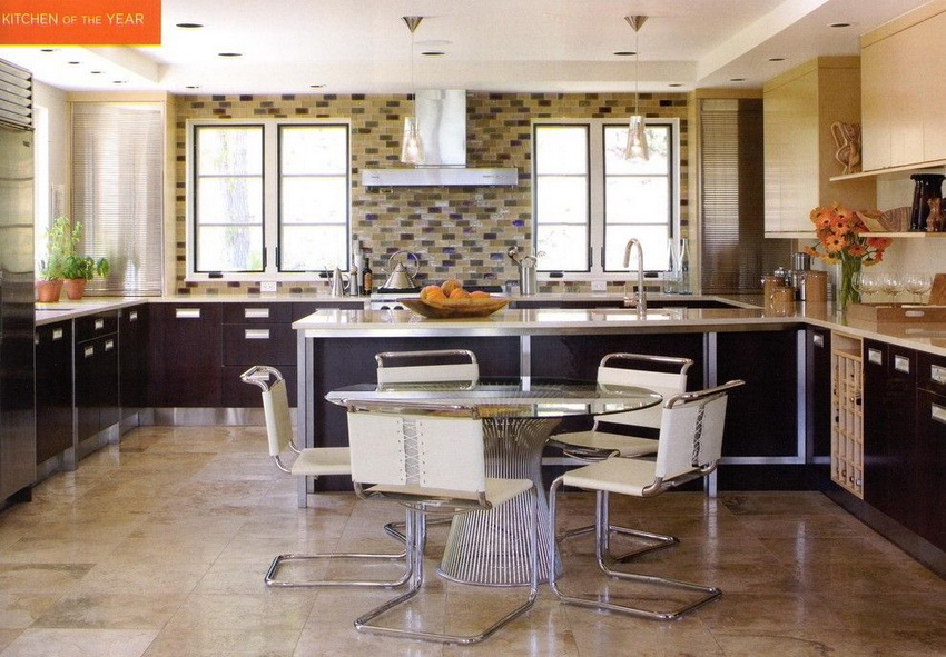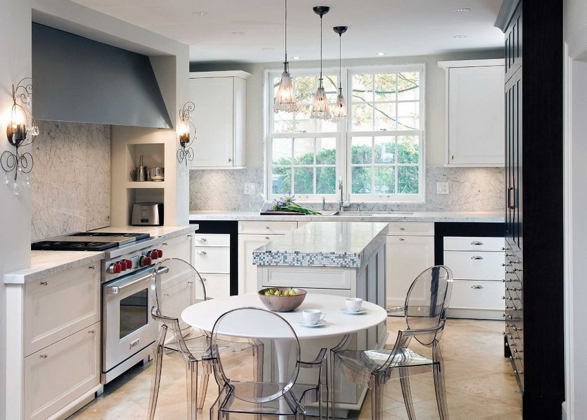 The most important aspect is the choice of style. A wooden round table on one massive carved leg cannot be found in the kitchen, where the design is based on the high-tech style. The glass structure on metal legs will be "alien", surrounded by classic furniture made of wood. To know, understand and own a sense of style, it is worth looking at the proposed photos of round tables in the interior of the kitchen. This selection clearly demonstrates the possible combinations of shapes, materials and colors.