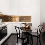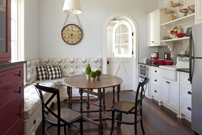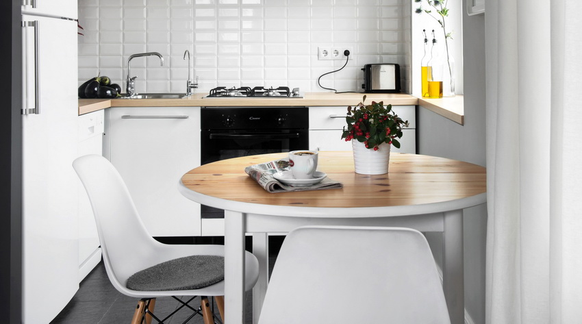 Setting up a round table in a small kitchen is extremely difficult. Most likely you will have to save space at the expense of other furniture. If the placement area has dimensions of 220x220 cm or slightly less, the diameter of the round table in the kitchen 80 cm is the most acceptable option.