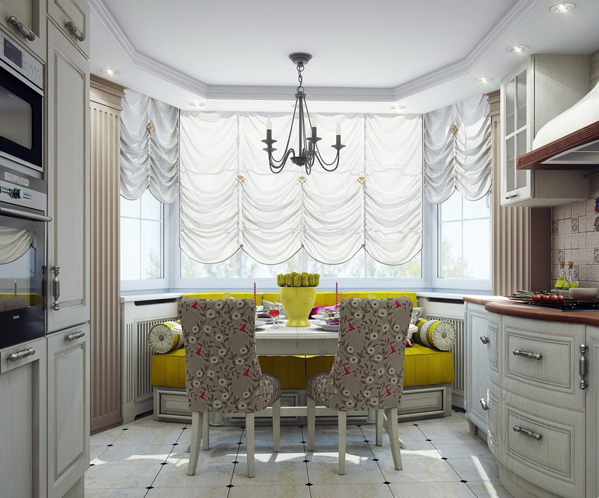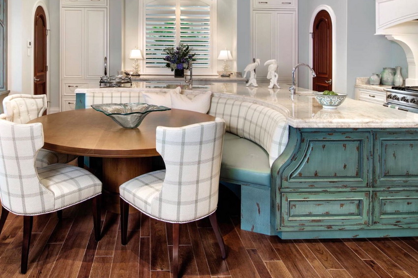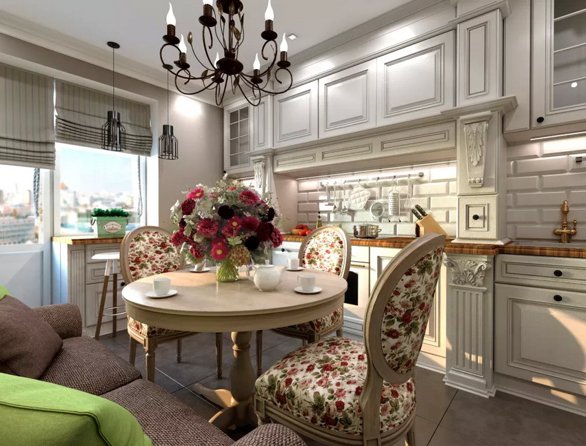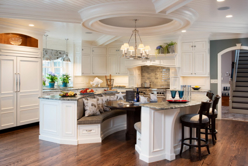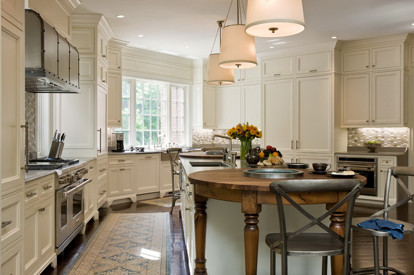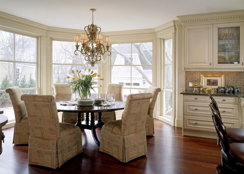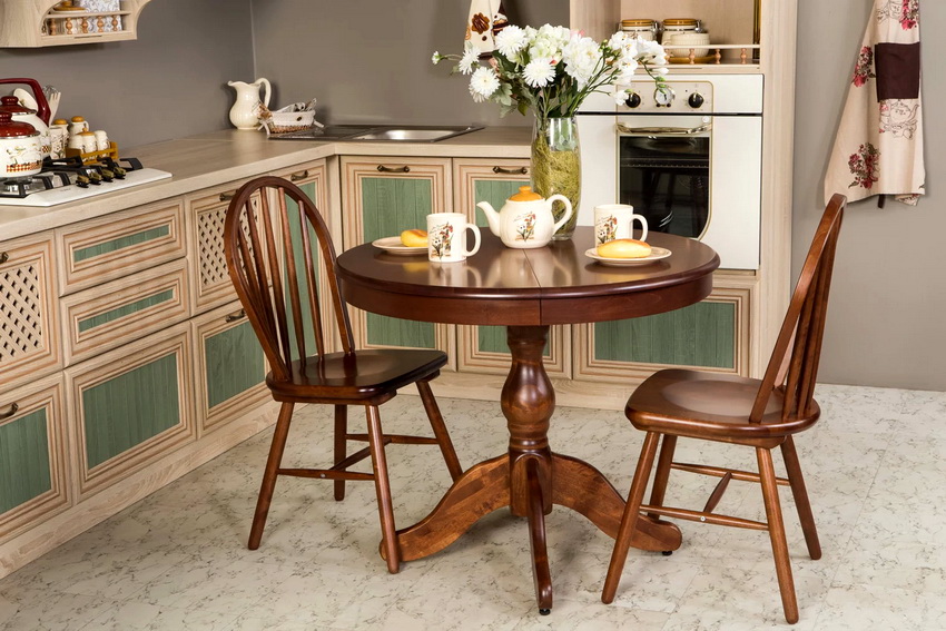 With the advent of the technical feasibility of making round tabletops, they began to be used to create an interior of almost any style. Round surfaces with carved elements are still installed in kitchens by adherents of the classic trend.