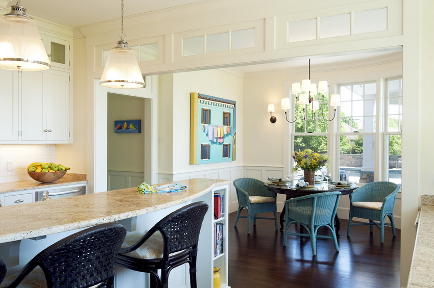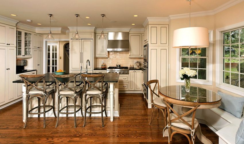 For a rectangular room, a round version is more suitable, an oval table for a square kitchen. With such an arrangement, there is no feeling of obsessive geometricity, there is a feeling of a room, and not just furniture "correctly" placed in the room.