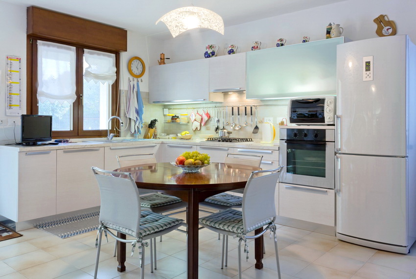 Carefully and thoughtfully, you need to approach the purchase of a round white table in the kitchen. Such a color, easily combined with any other shades, in this case becomes demanding and strict in relation to the adjacent color scheme.