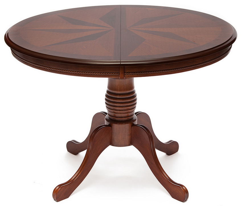 A common model is a sliding round table on one leg with a MDF top. The support in such a model can be carved, wooden (or made of the same wood material), have a square or rectangular shape. Such a leg in the lower part is complemented by a “penny” that enhances stability.