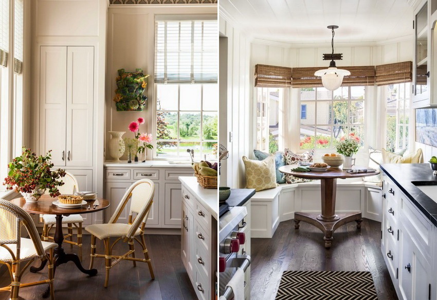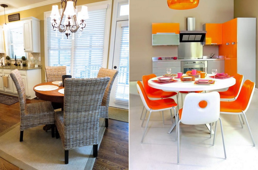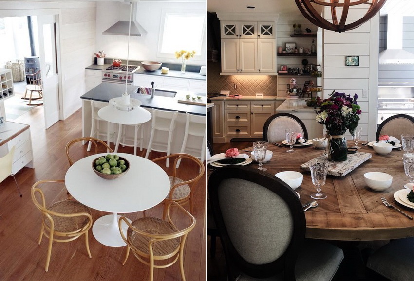 For ethno, country and Provence styles, rounded tables are characteristic, made of wood with a protective and decorative coating applied in such a way that the natural structure of the wood appears. Round tables and chairs for kitchen when creating interiors in the modern genre.Such furniture is distinguished by its laconicism, the absence of additional decorative elements. Tabletops can have a smooth surface, they are monochromatic. Even more practical models of round tables are inherent in minimalism, in which all lines are geometrically correct and the elements are functional.