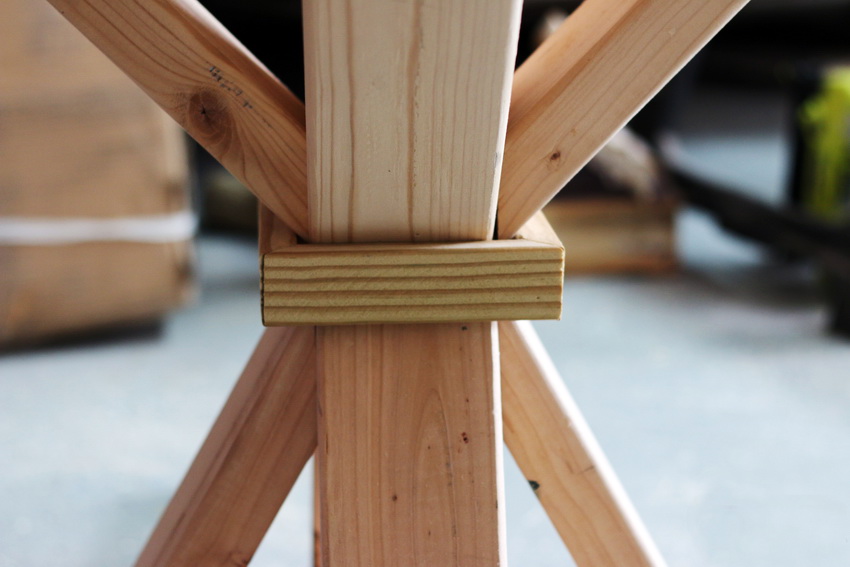 In a similar way, you can independently make a round table for the kitchen on one leg. An additional 100x100 mm square bar is required for the main support element. It attaches to the center of the crosspiece. Then the prepared bars for the legs are cut in half (there are 8 of them), cuts are made on each of them at an angle of 45 ° from all sides, 4 legs are attached to the middle of the cross bars and to the center of the main support. The remaining 4 parts are fixed to the middle of the main bar-leg and diverge to the sides, increasing the support area of the entire structure.
