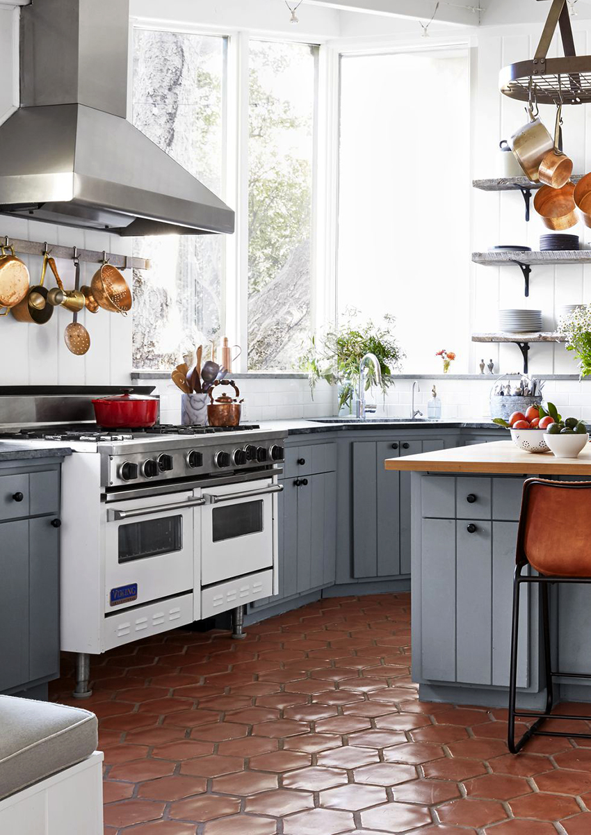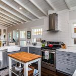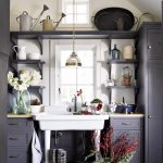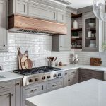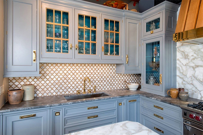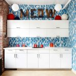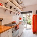 Also in the photo of kitchen headsets, you can find options for using roof rails, which are a metal pipe on which hooks and hinged shelves are placed. The rails are used to hang useful accessories such as potholders, ladles, spice jars, towels, cups and more. This accessory allows you to aesthetically leave useful items in sight and free up space on the work surface.