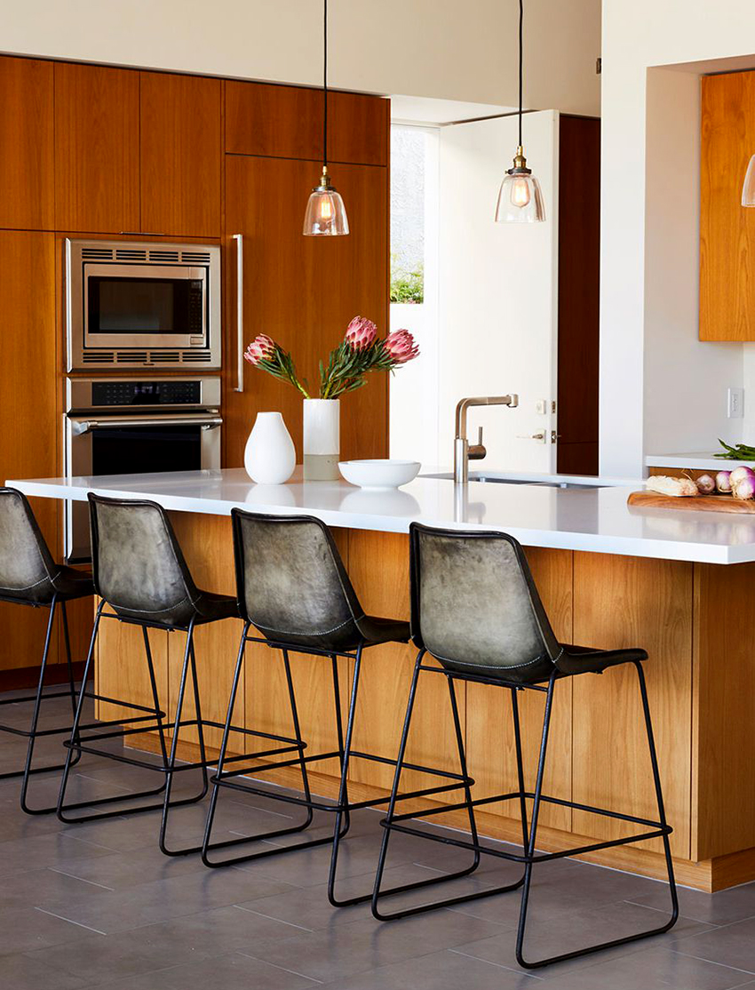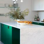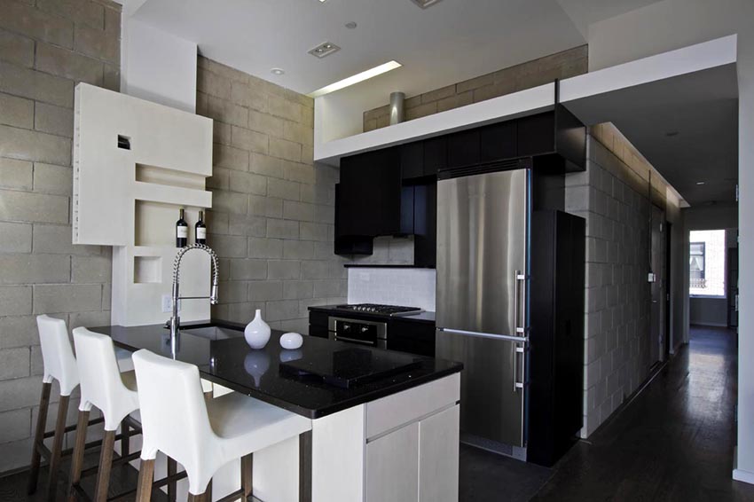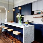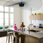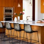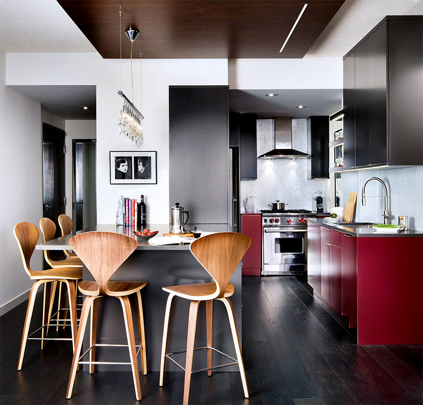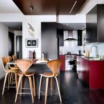 The bar counter is also considered one of the elements of the kitchen set. Due to its elongated shape and small width, it can be placed anywhere. Often the bar counter acts as an element of space zoning if the area of a small kitchen is increased by combining it with an adjacent room or balcony. The bar counter can be either a continuation of the kitchen set or act as a separate structure that plays the role of a working and dining area.
