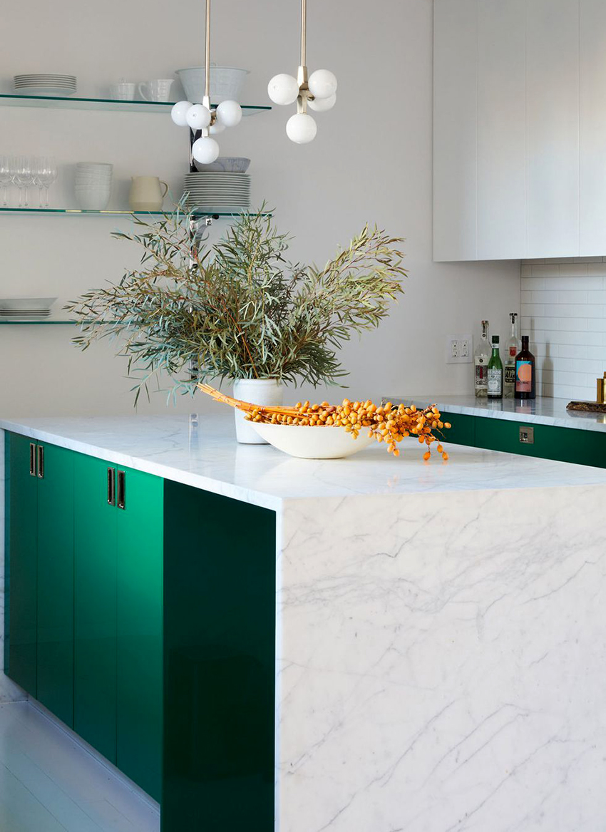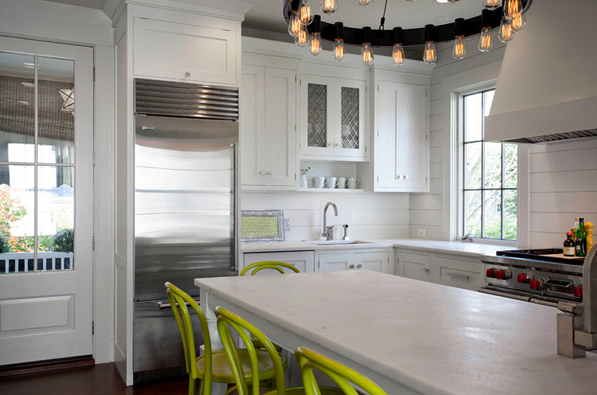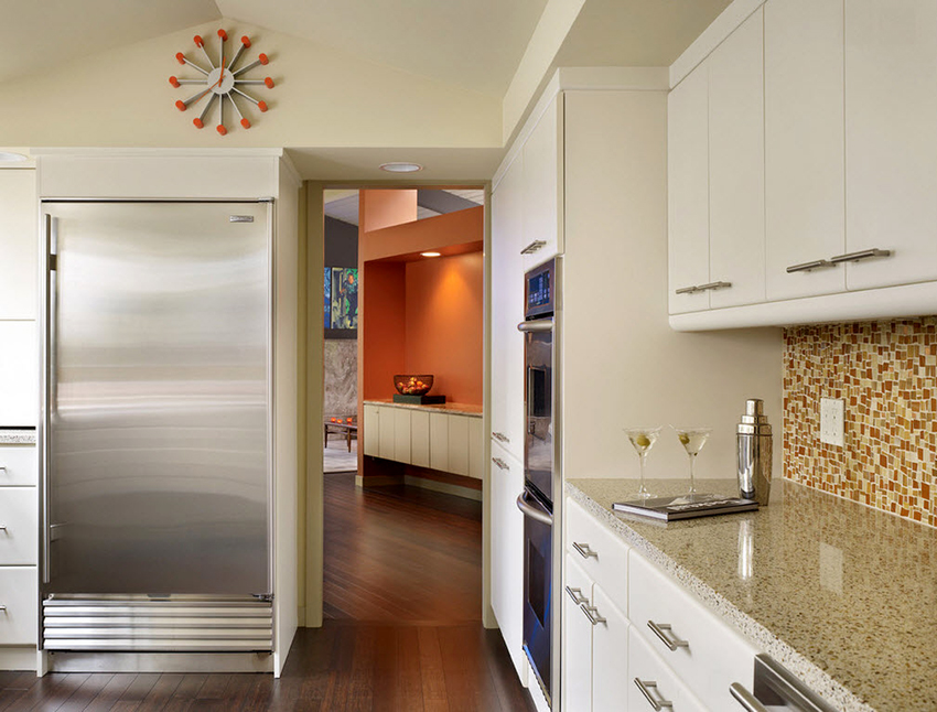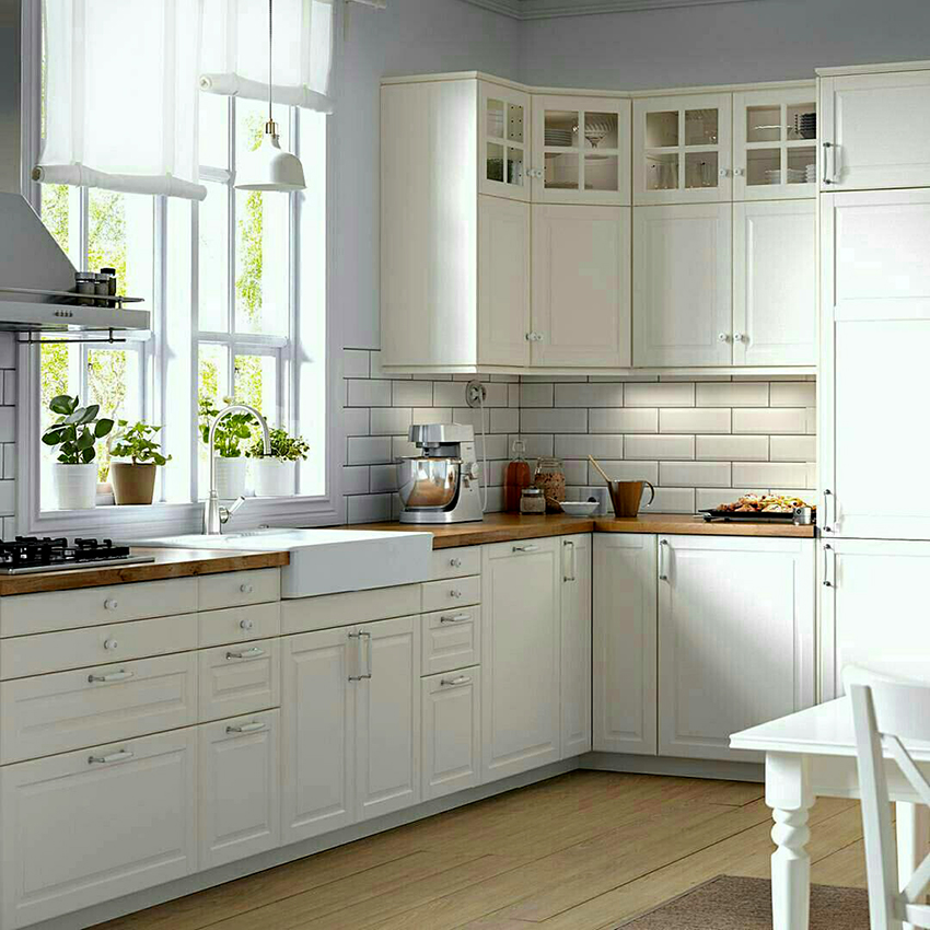 White color and its shades have always been popular and are still relevant in the design of kitchens of all sizes. The white kitchen unit is distinguished by its ability to reflect light, which creates the effects of lightness and spaciousness. If you add mirrored surfaces to white facades, you can visually increase the area of the room even more.