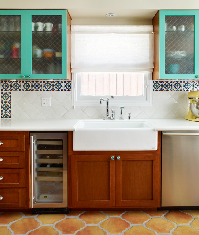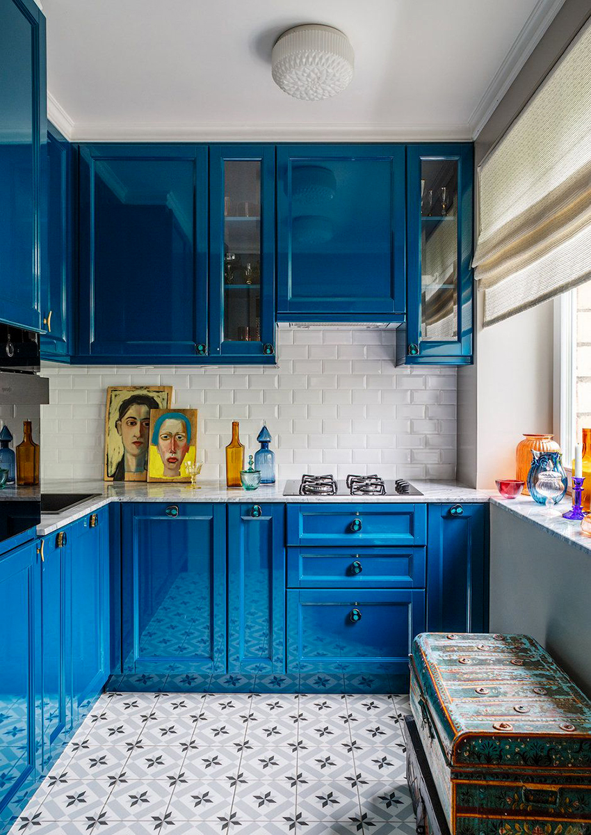 Bright colors are more typical for Provence styles, boho, fusion and loft. In order not to make the room too colorful, it is better to perform bright facades against the background of monotonous walls in a contrasting color. Looking through a selection of photos of kitchen facades, you can see that gray, red, blue, blue, yellow and orange, pink are considered popular colors. Even black, if used correctly, can decorate a small room.