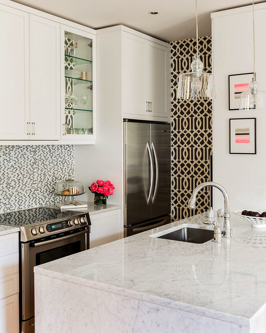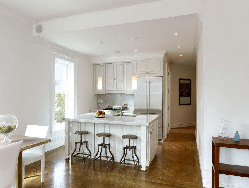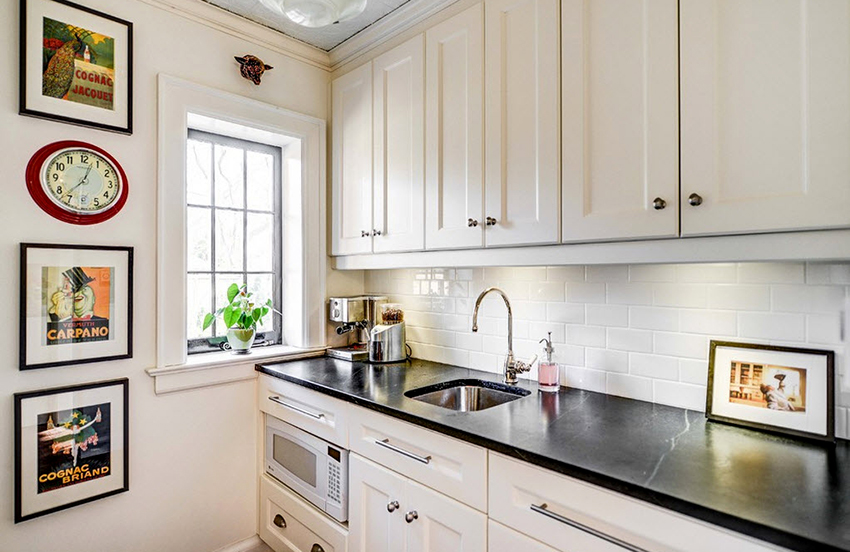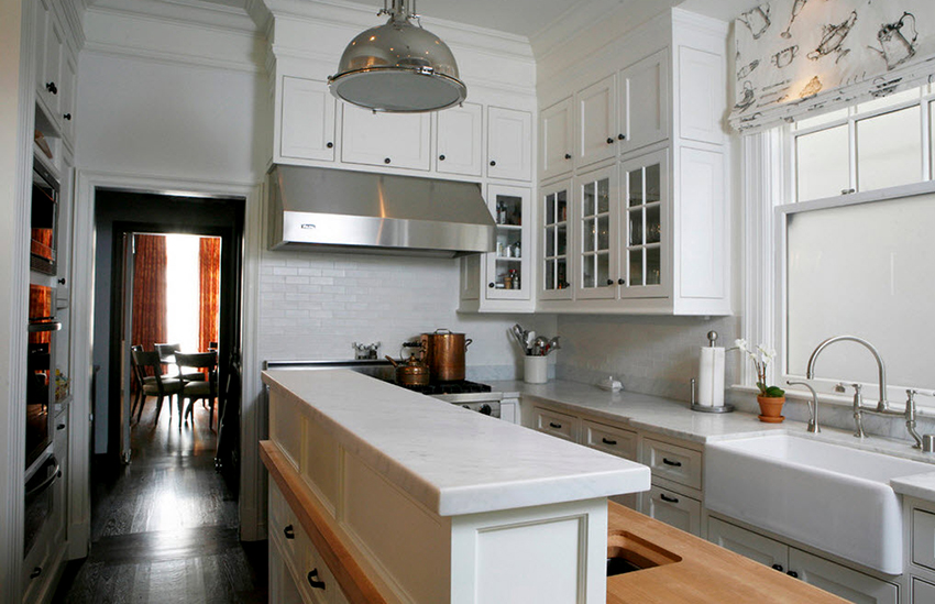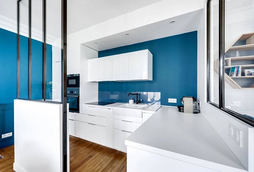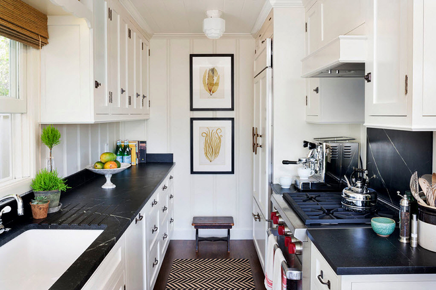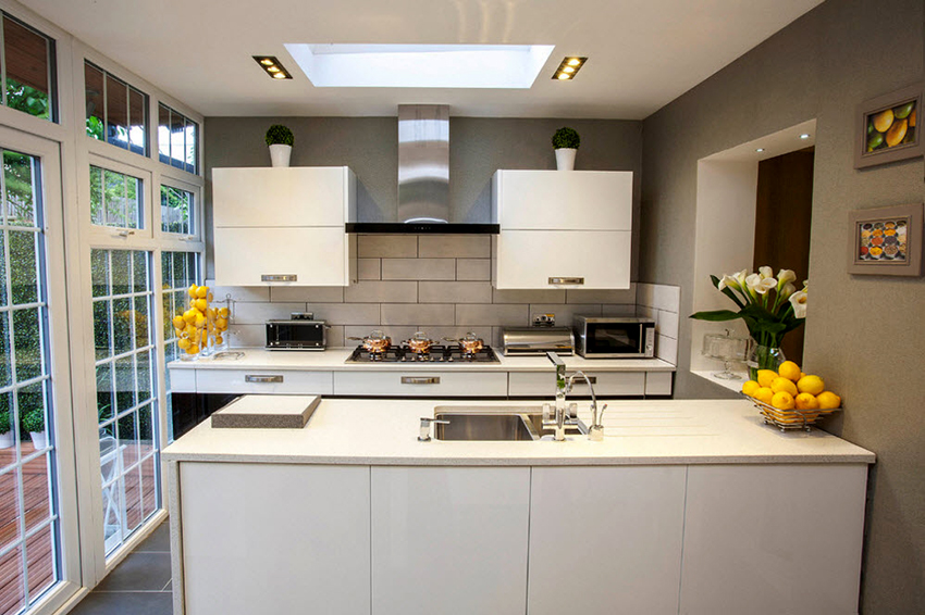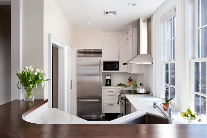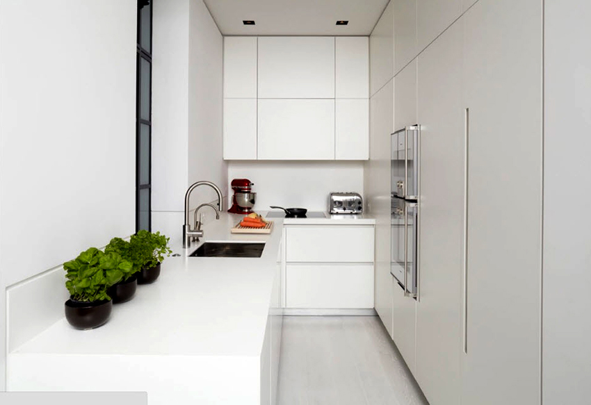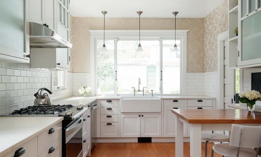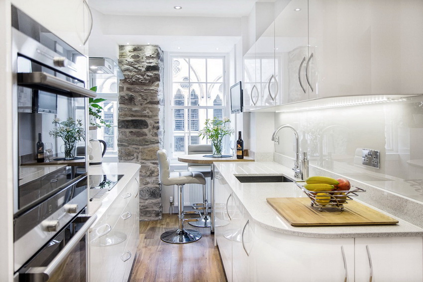Despite the fact that white is considered a soiled color, it is much easier to care for it. To slightly diversify the setting of a small white kitchen, it is recommended to add several contrasting textures or colors to the interior. White is versatile, so it goes well with other shades. For example, the facade of a white kitchen unit can be diluted with red, black, purple, pink, or another color. If you decide to choose a completely white kitchen set, then it can be shaded with surfaces that will be slightly darker than the facades and the backsplash.