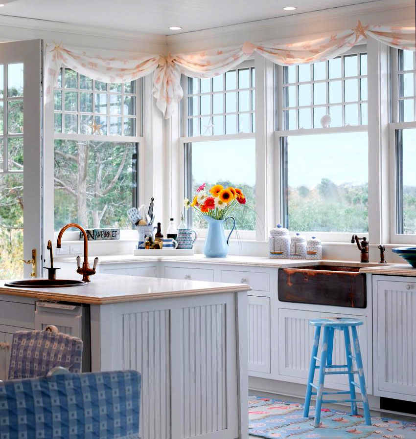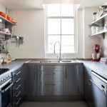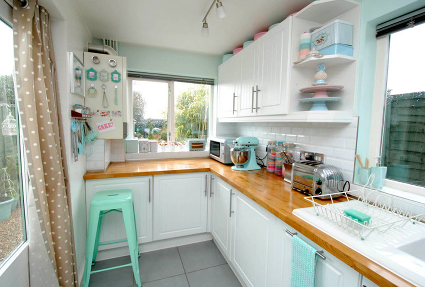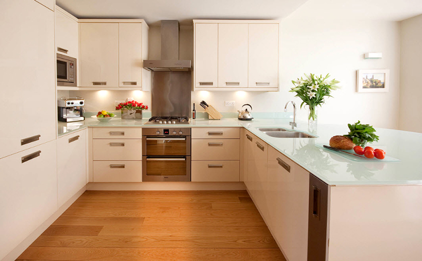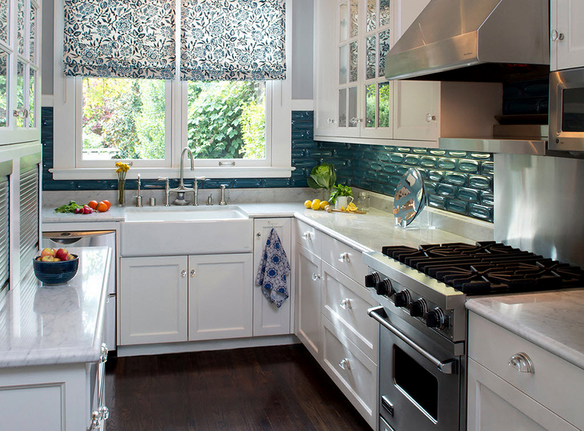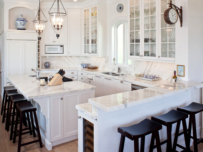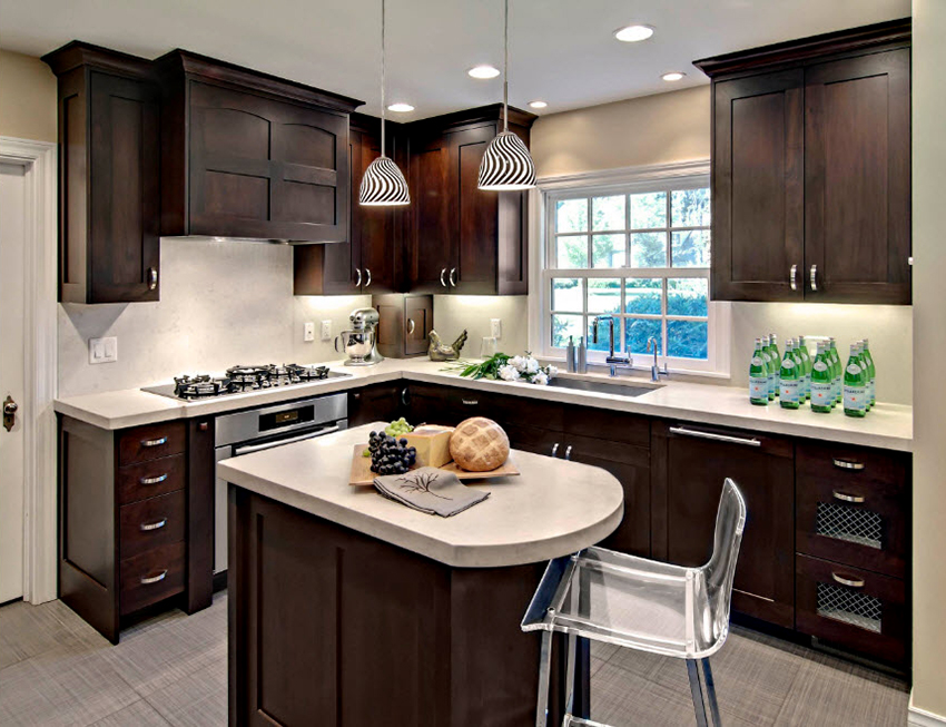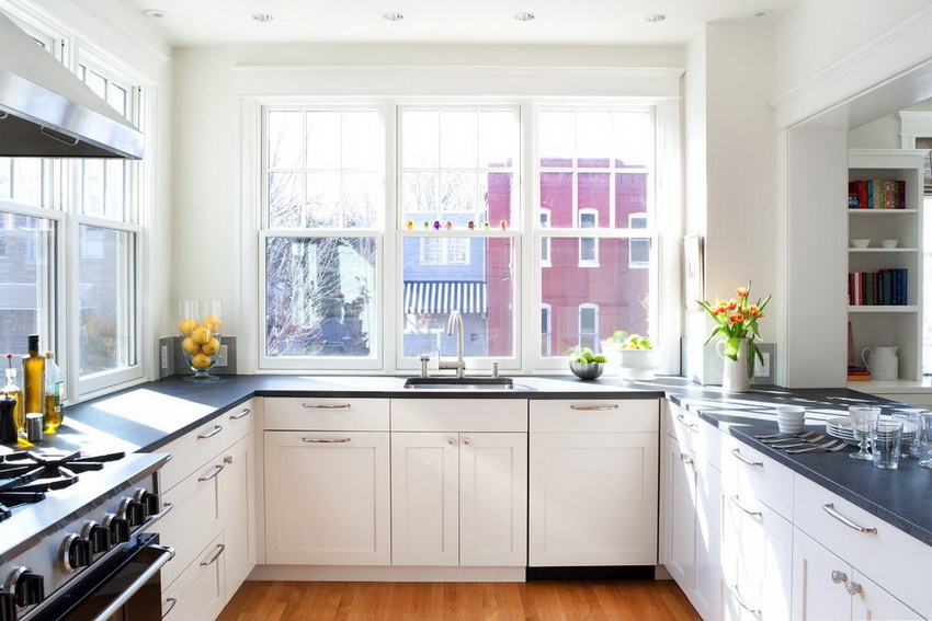 - U-shaped. Takes up space along three walls while capturing two corners. Previously, this option was considered suitable for large kitchens. But even in a small kitchen, you can position the countertop and sink to the window, and bring the desktop to the window and use the window sill to increase it. U-shaped kitchens are often complemented by a small bar counter.