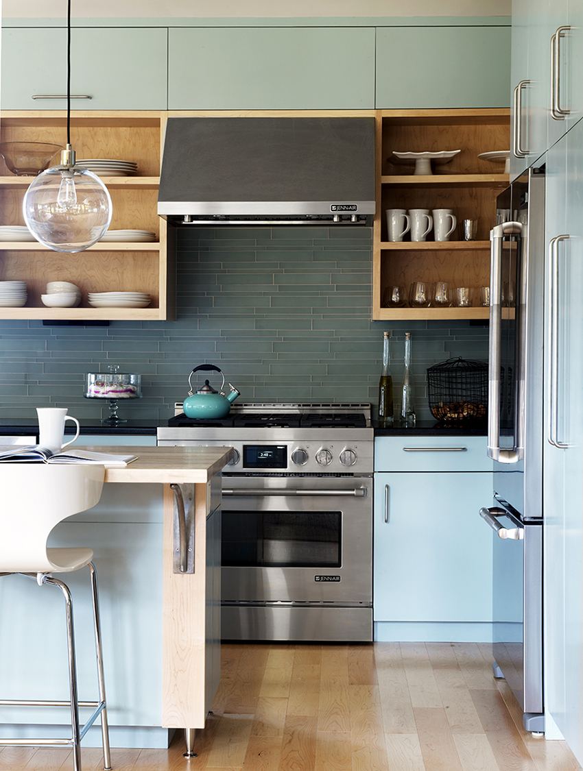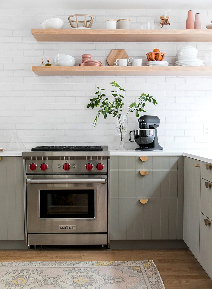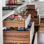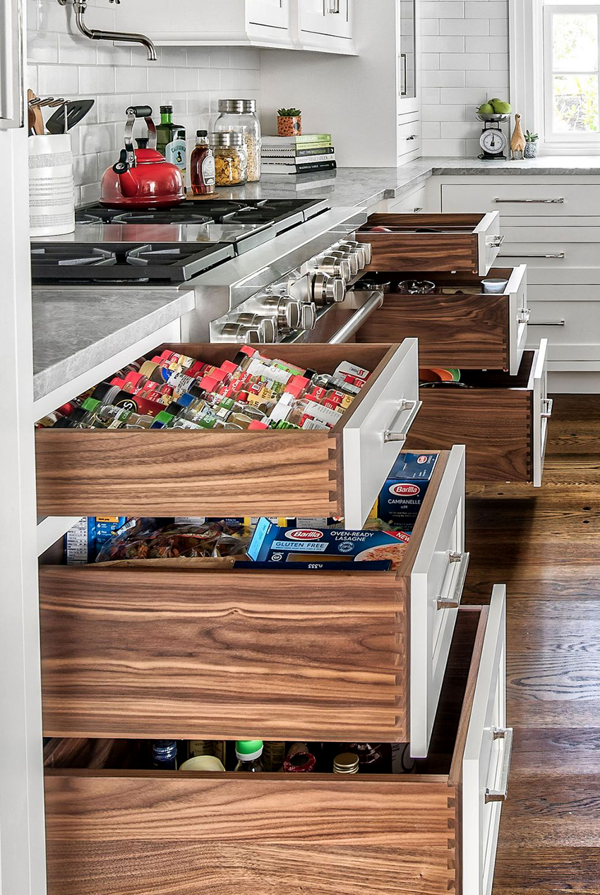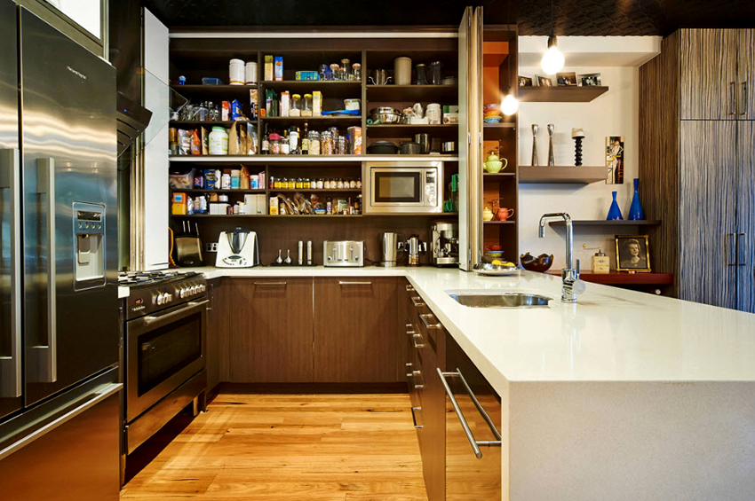 On open shelves, there is no way to install modern sliding fittings, which will allow you to place more dishes, food and other kitchen accessories. The drawers are more spacious. Also, various containers, nets and baskets are used, which make it possible to optimize the storage of kitchen utensils.