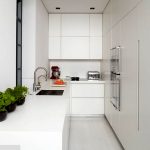 - Linear. An option assuming that appliances and furniture are located along the length of one of the walls. As a rule, this type of headset is chosen in a very small space, when there is not enough space to create a working triangle. In this case, the worktop is placed between the hob and the sink, and it is better that the refrigerator is also as close as possible.