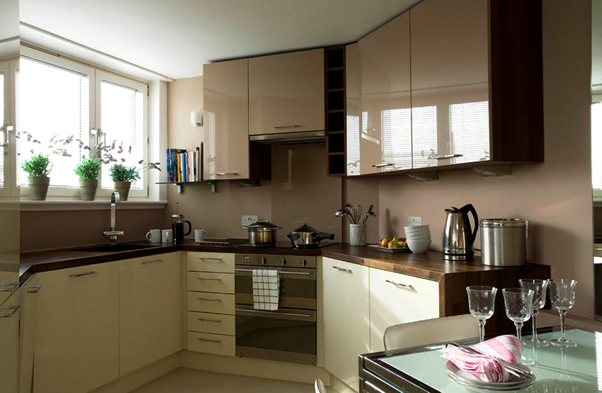 - Material. In a small kitchen, a glossy kitchen set made of plastic or high-quality MDF will look good. A reflective surface will add volume to the space and make the room visually larger.