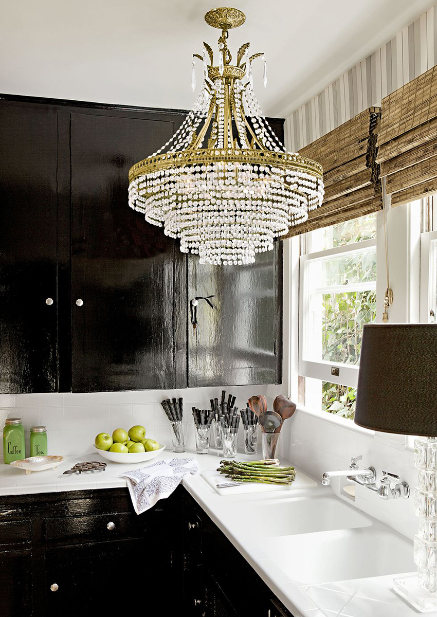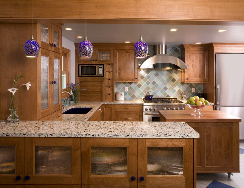 If you pay attention to the photo of kitchen furniture, you will notice a large number of built-in lamps. Lighting integrated into the furniture visually expands the kitchen area. You can also fix diode tape under the lower part of the wall cabinets above the sink and the work area.