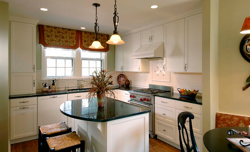 - Ostrovnoy. In a small kitchen, it is permissible to use a pivoting island structure, which includes both working equipment and cabinets, but of minimal dimensions. Such a kit should not be attempted to be installed in a kitchen of less than 9-10 m². And you also need to take into account that the price of a kitchen set for a small rotary kitchen will be higher than the standard one.